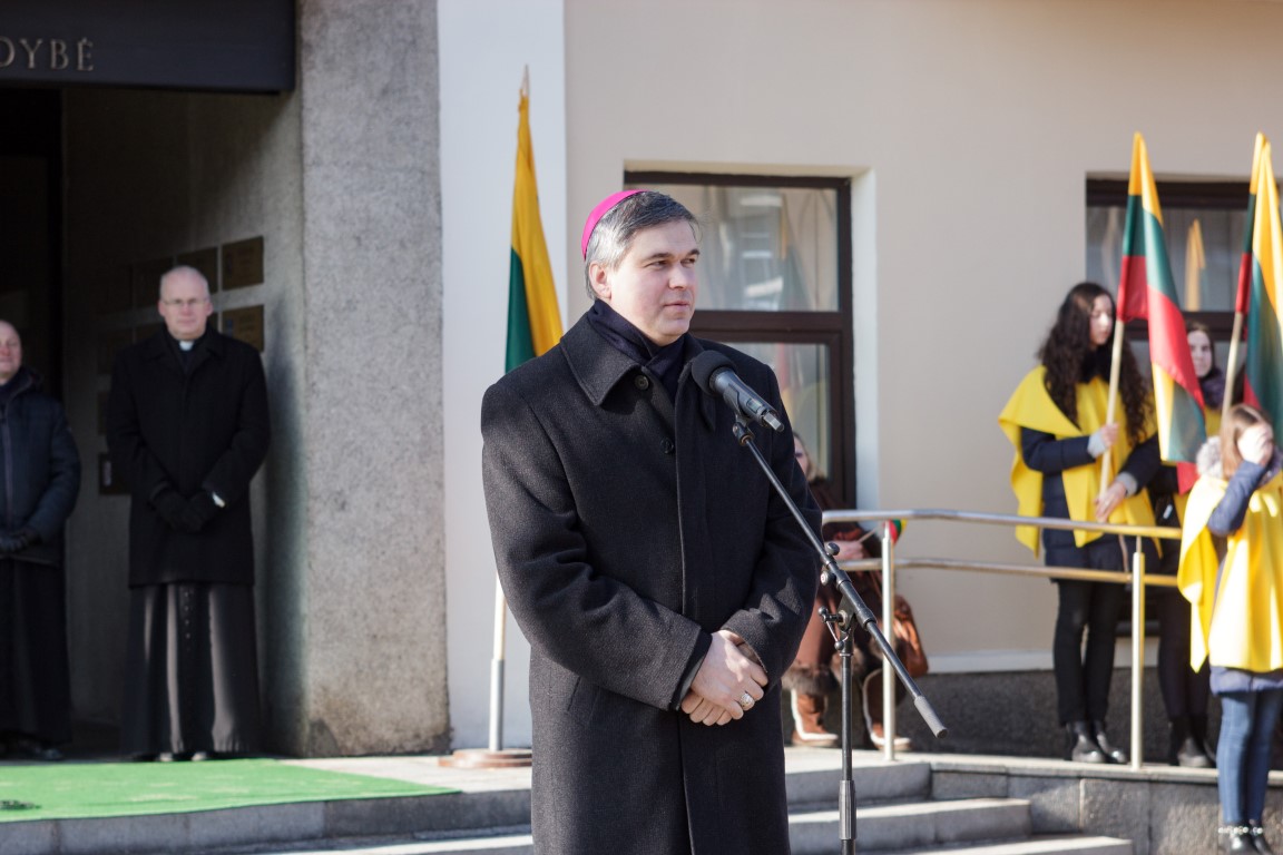 „O kaip mes kuriame Lietuvą? Kokią matome Lietuvos ateitį?“, – vyskupas ragino susimąstyti ir susirinkusiesiems į Laisvės aikštę linkėjo gerumo, pakantumo.