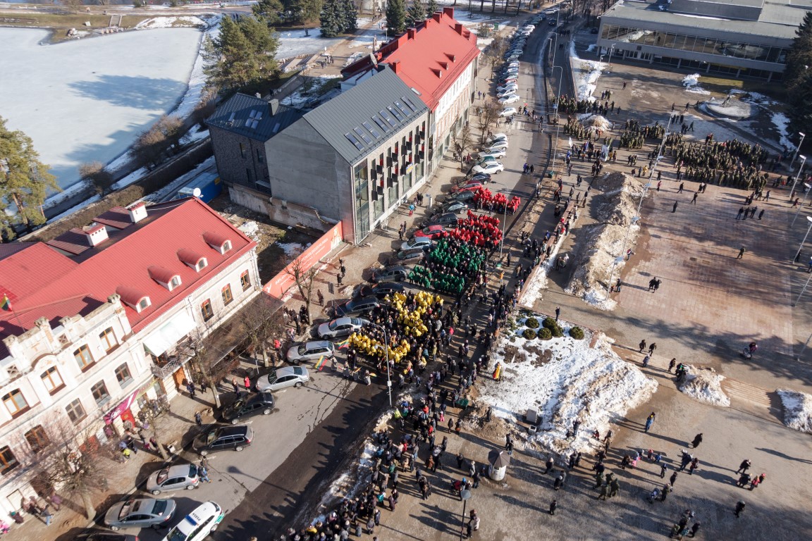 Po iškilmingo minėjimo ir vėliavos pakėlimo ceremonijos Laisvės aikštėje per keturis šimtus žmonių, kurių dauguma apsigobė geltonomis, žaliomis, raudonomis skraistėmis, sustojo į simbolinį žodį „Laisvė“.