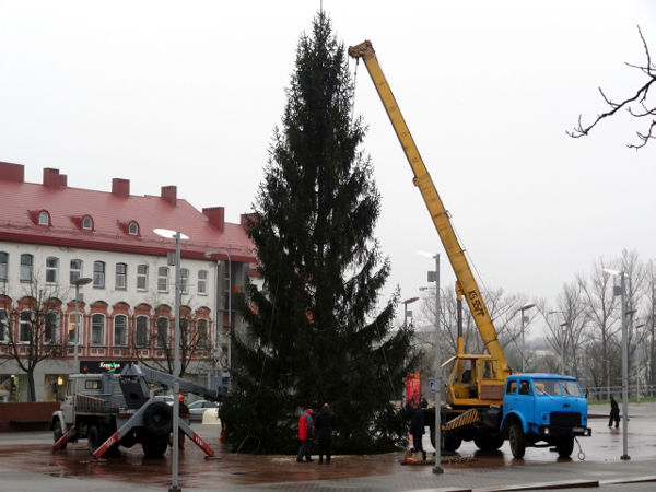 Šiandien į Panevėžio miesto Laisvės aikštę atvežta 17 metrų aukščio Kalėdų eglė, netrukus prasidės jos puošimo darbai.