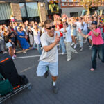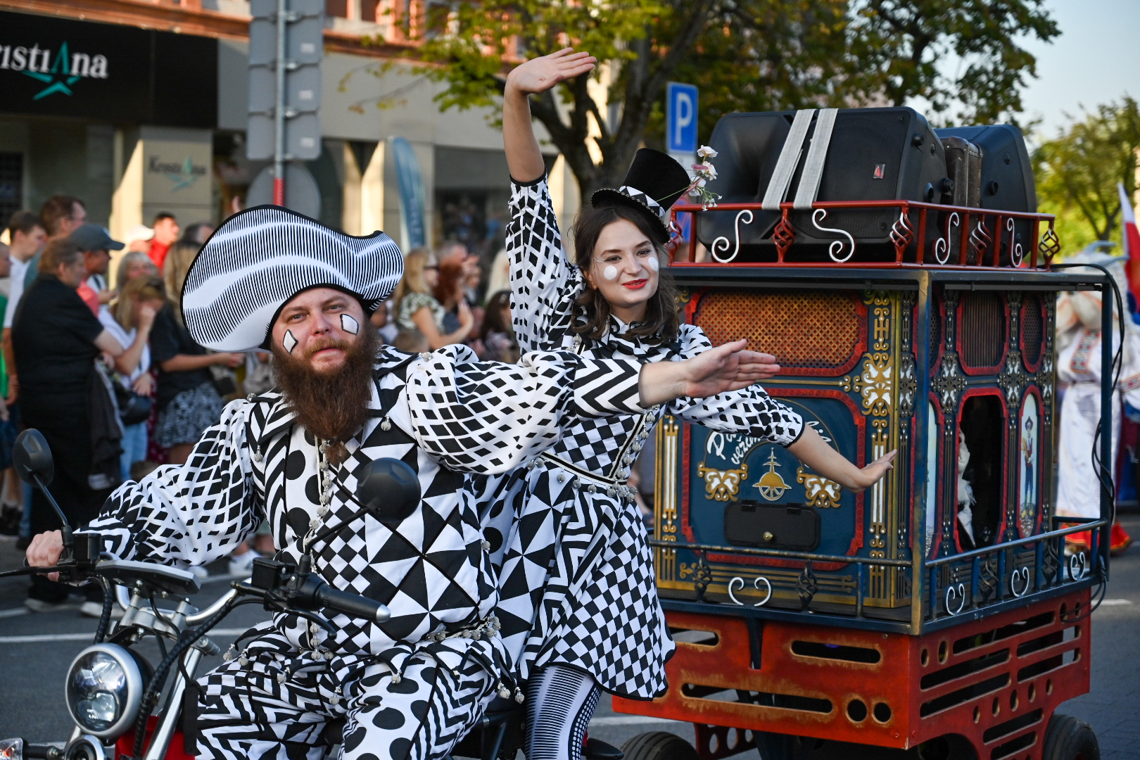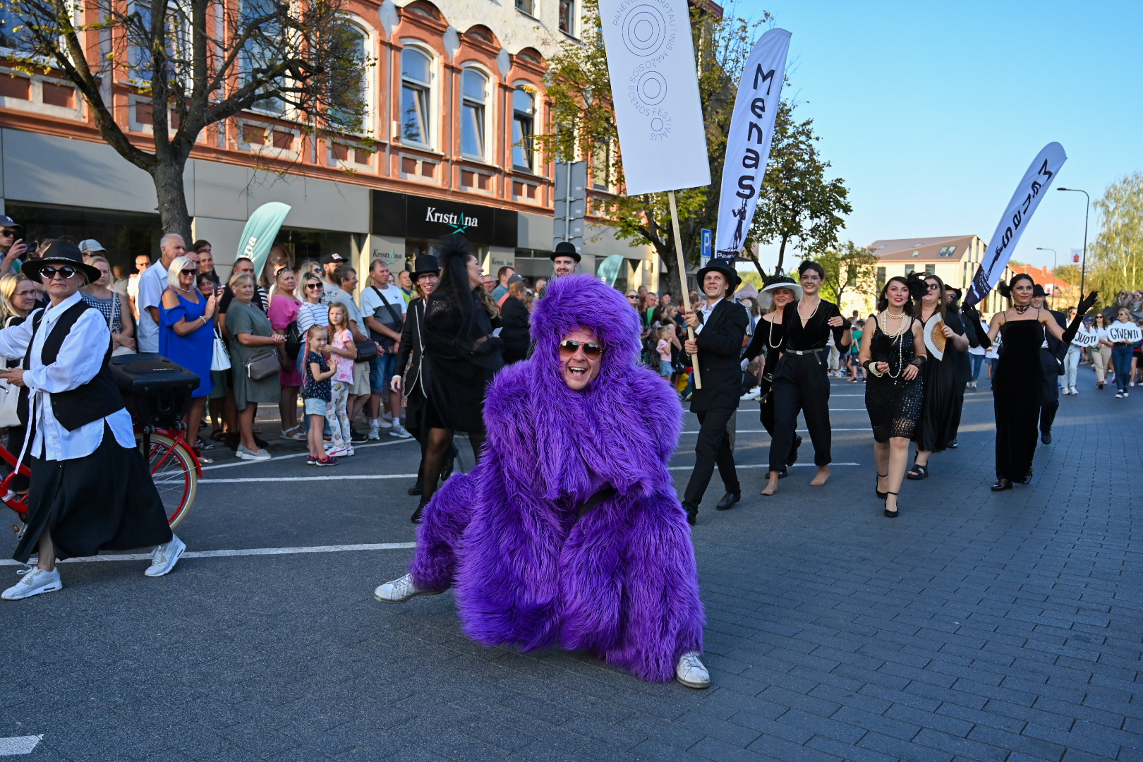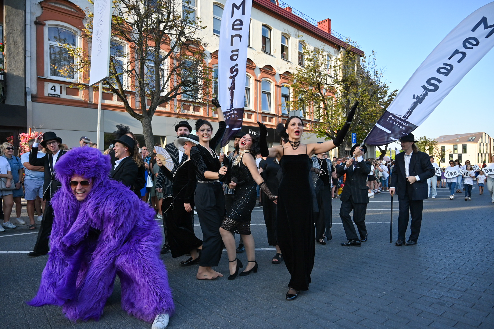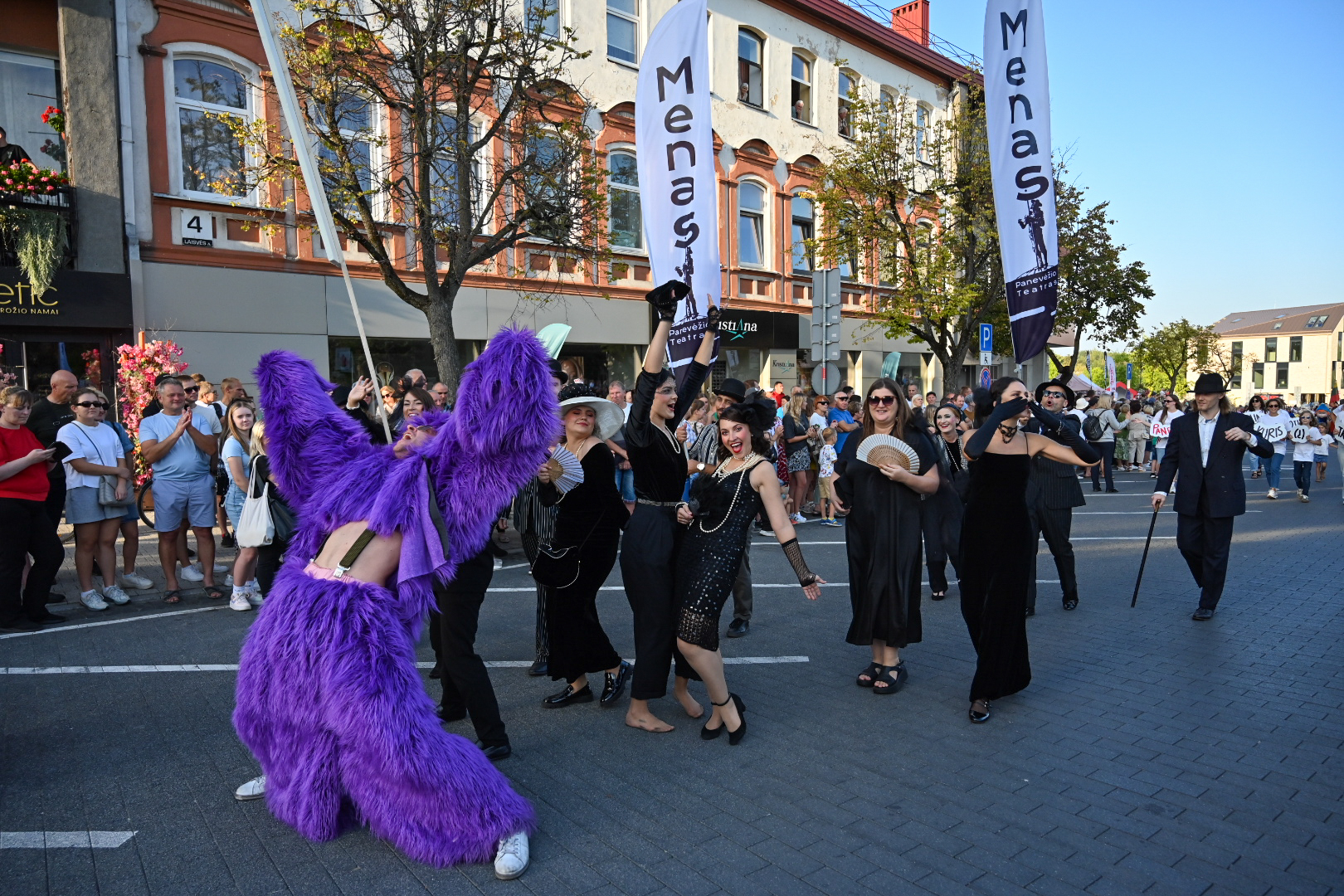 Kadangi šiemet panevėžiečiai savo miesto 521-ąjį gimtadienį švenčia su šūkiu „Meno ritmu“, Panevėžio teatrai miestiečius džiugino spalvingais kostiumais ir kaukėmis, šokių klubai įtraukė publiką ugningais pasirodymais, žiūrovus linksmino kartu su dviračių klubu mynęs klounas.