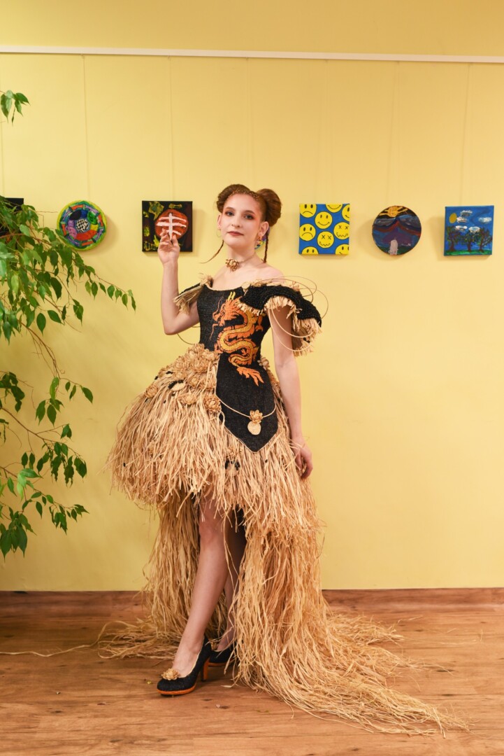 Skrupulingai iš smulkiausių moliūgų sėklų sudėliota unikali suknelė ir prie jos derantys bateliai, dekoruoti tokiomis pačiomis medžiagomis. Antakį kilstelėti verčia puošni suknia iš samanų, džiovintų apelsinų, citrinų, greipfrutų riekelių, lęšių, ryžių, pipirų ir priderinta neįtikėtino dydžio ir svorio kankorėžiais padabinta skrybėlaitė. Tai tik keletas kūrinių. Jais nesustoja stebinti ši išskirtiniu talentu apdovanota mergina.