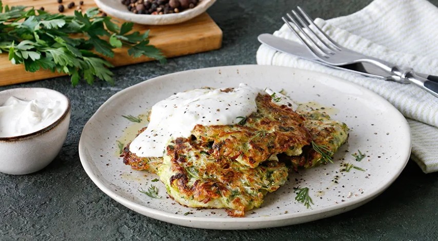Reikės (3 porcijoms): 500 g jaunų cukinijų, 1 nedidelio svogūno, 1 kiaušinio, 3 šaukštų miltų, 4–5 šakelių petražolių, krapų, druskos, juodųjų pipirų, aliejaus kepti; patiekti: grietinės, 1–2 česnako skiltelių.