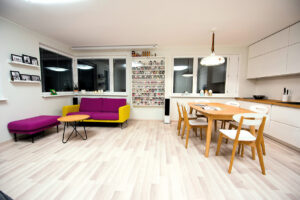 Per nepilnus tris mėnesius visiškai atnaujintas butas viename Vilniaus mikrorajonų nustebina taip, kad suabejoju tuo, ką matau. Sukirba mintis grįžti į laiptinę ir pasitikrinti, ar čia tikrai tas pats namas – paprastas standartinis daugiabutis, kokių daugybė? Nes butą, kuriame gyvena penkių asmenų šeimyna, kur kas lengviau įsivaizduoti moderniame naujos statybos daugiabutyje.