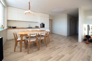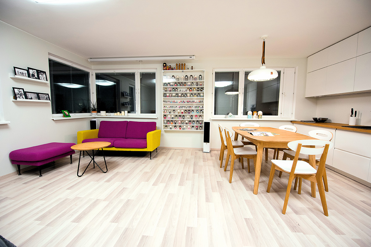 Šviesių tonų didumai kontrastą sudaro ryški sofa. Nedidelė, tačiau iškart pastebima, ji harmoningai dera su japoniškų lėlių – šiuolaikinio stiliaus („Kimmidoll“) ir klasikinių (kokeshi) kolekcija. Virtuvės ir valgomojo zonoje vyrauja baltos spalvos ir natūralaus ąžuolo paviršių derinys. Dar gerokai iki remonto pradžios nusižiūrėtas stalas bei šviestuvas virš jo pasufleravo toną ir virtuvės baldams – stalviršis pagamintas iš tokios pat ąžuolo medienos.