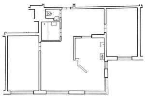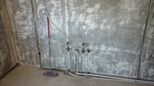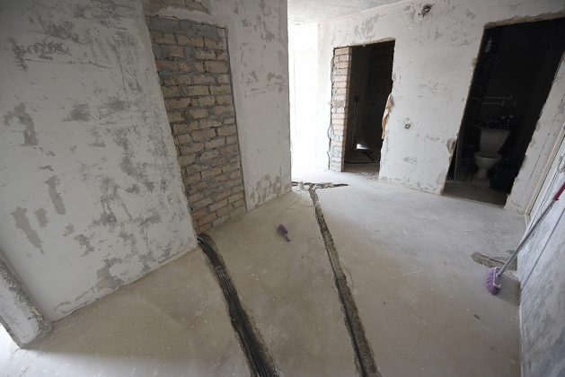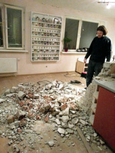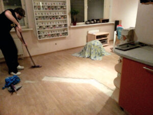 Antra, reikėjo išgremžti kanalus vamzdynams ir elektros laidams, mat, pakeitus virtuvės vietą, ankstesnis komunikacijų išdėstymas nebetiko. Meistrai iš naujo paklojo elektros instaliaciją ir nutiesė vandentiekio bei nuotekų vamzdžius. Drauge buvo pakeisti ir visi kištukiniai lizdai, jungikliai.