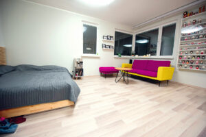 Prieš įsigydami baldus, Vaidas ir Rūta kruopščiai matavo patalpas ir „stumdė“ juos iš vietos į vietą. Kad būtų lengviau įsivaizduoti, kiek erdvės užims vienas ar kitas baldas, jo vietą ant grindų žymėdavo lipnia juostele. Nors buto plotas nemažas, vis tiek norėjosi išsaugoti kuo daugiau laisvos erdvės.