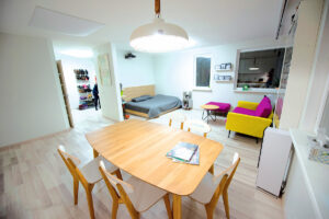 Iškėlus virtuvę, atsilaisvinusi niša kuo puikiausiai tiko miegamojo lovai – tereikėjo užmūryti durų angą ir nugriauti barą. Prie langų atsirado vietos minkštiesiems baldams, o virtuvės zonoje – dideliam valgomojo stalui, kuris dabar yra pagrindinė šeimos ir svečių susibūrimo vieta.