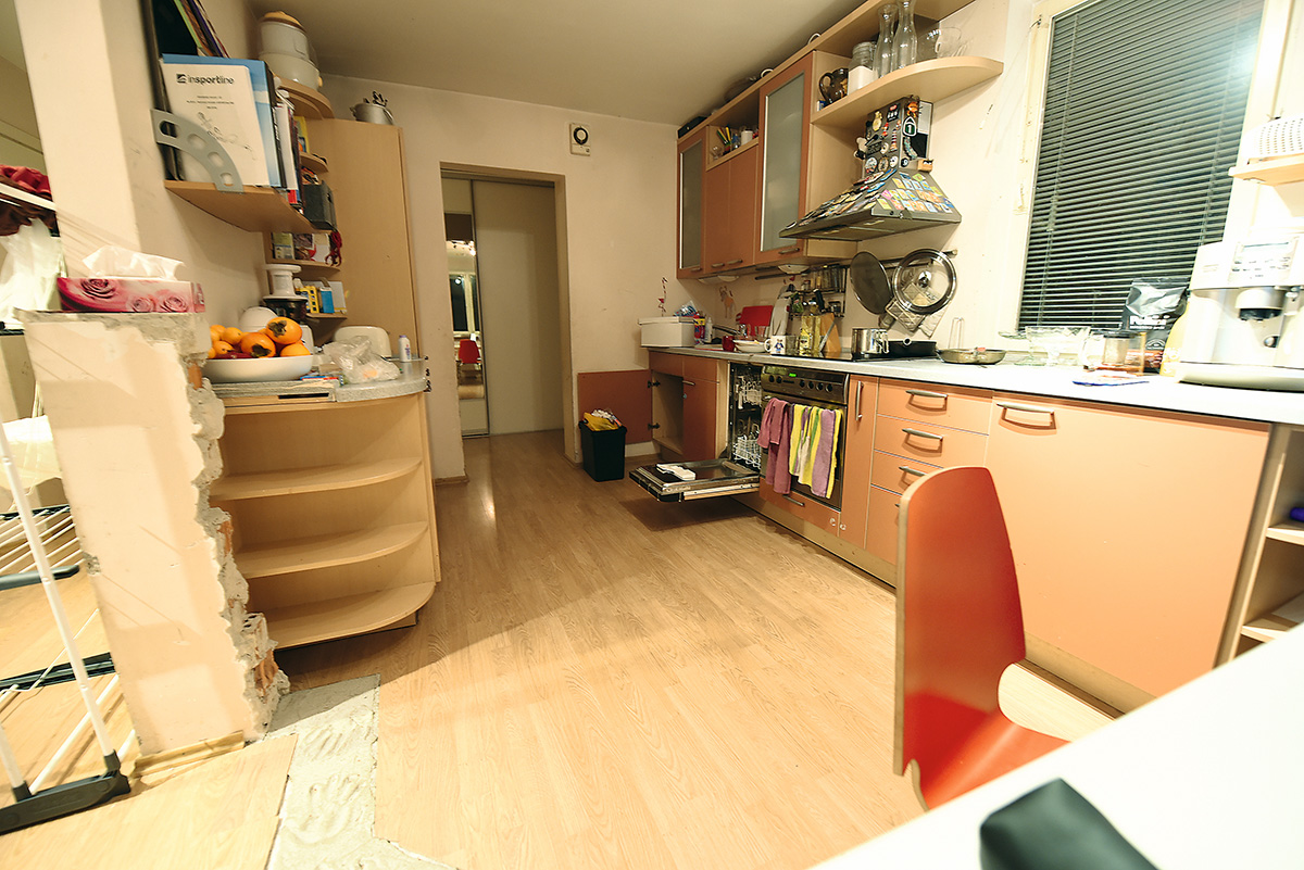 Daugiausia galvos skausmo kėlė virtuvė. Iki tol tarp dviejų darbastalių buvo durys, o pati virtuvės zona buvo savotiškoje nišoje. Be to, dar buvo išmūrytas baras, ant kurio užsilipti labai rūpėdavo mažiesiems. Du kambarius buvo nuspręsta atiduoti vaikams: vieną – paaugliui sūnui, antrą – dviem sesutėms. Tačiau tuomet reikėjo sugalvoti, kur įrengti tėvų miegamąjį. Ilgus svarstymus išsprendė netikėtai pusiau juokais šeimininkės pasakyta mintis, kad virtuvę reikia iškelti į priešingą patalpos pusę. Ir vos tik nuskambėjusi, ši mintis tapo pagrindiniu bendros erdvės perplanavimo raktu.