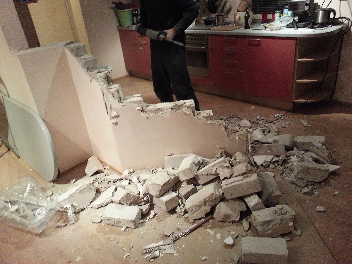 Antra, reikėjo išgremžti kanalus vamzdynams ir elektros laidams, mat, pakeitus virtuvės vietą, ankstesnis komunikacijų išdėstymas nebetiko. Meistrai iš naujo paklojo elektros instaliaciją ir nutiesė vandentiekio bei nuotekų vamzdžius. Drauge buvo pakeisti ir visi kištukiniai lizdai, jungikliai.