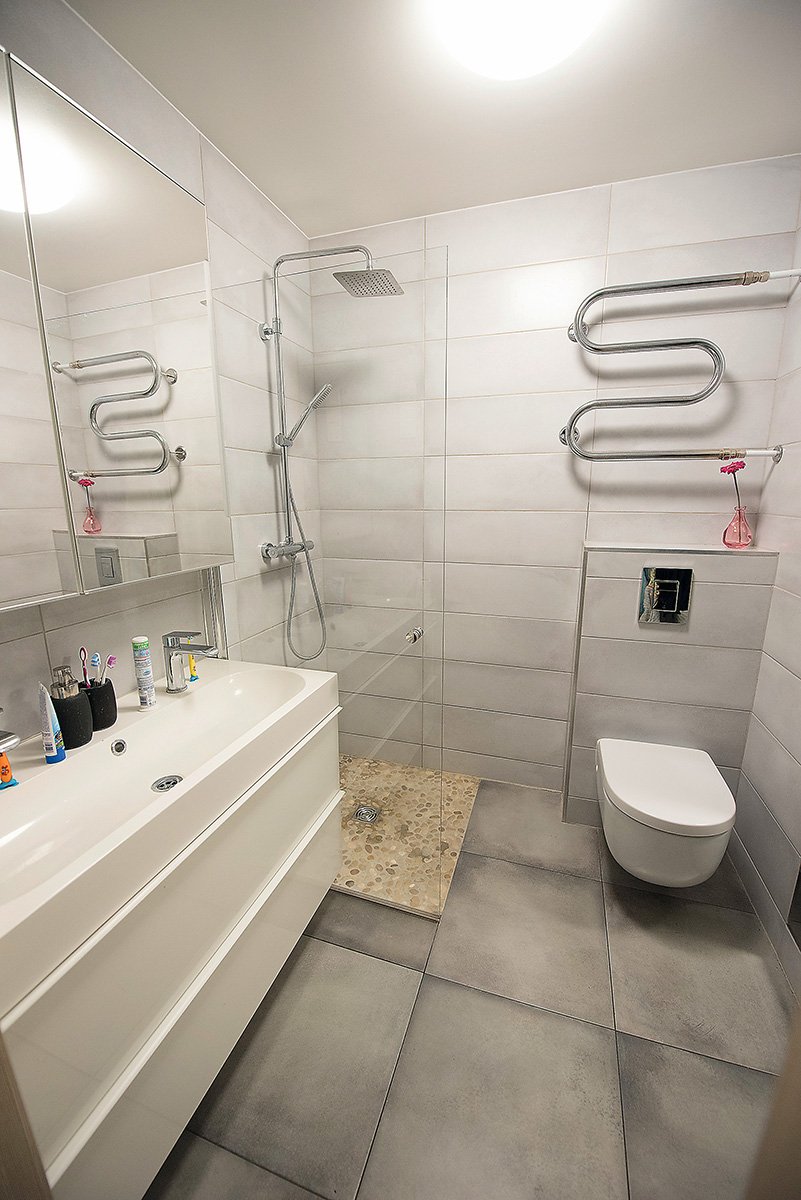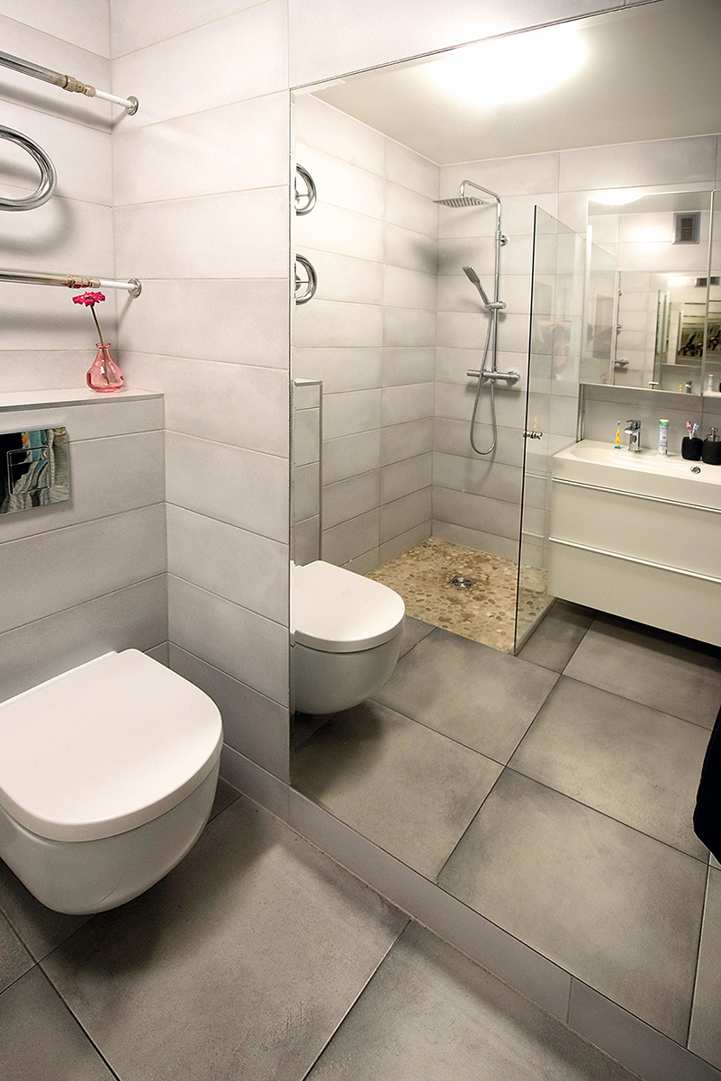 Iki remonto bute buvo vonios kambarys ir tualetas. Tačiau penkiems žmonėms tai nėra patogus variantas, todėl tualete papildomai sumontuota nedidelė praustuvė. O štai buvęs vonios kambarys pertvarkytas iš pagrindų: išmontuota vonia ir visi kiti santechnikos prietaisai, vietoj jų įrengtas dušas, plati praustuvė ir klozetas.