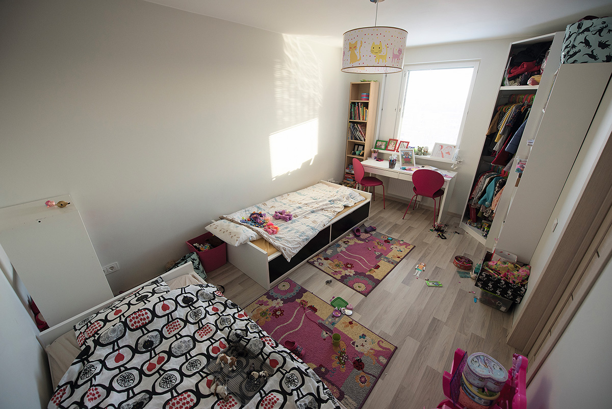 Dukterų kambarys iškart išduoda, kad čia – dviejų linksmų, mėgstančių piešti ir žaisti mergaičių kambarys. Žaismingas šviestuvas ir kilimai, ryškios spalvos, daugybė žaislų…