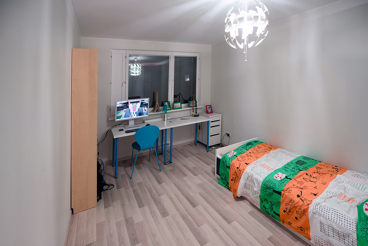 O štai sūnaus kambarys kur kas santūresnis. Dalis jo atitverta – čia įrengta ir drabužinė. Spintos pastatytos taip, kad drabužinę pasiekti būtų galima vaikino netrukdant. IKEA įsigytos spintos buvo tinkamo aukščio, lengvai ir greitai surenkamos, esant reikalui, ir lengvai išrenkamos.