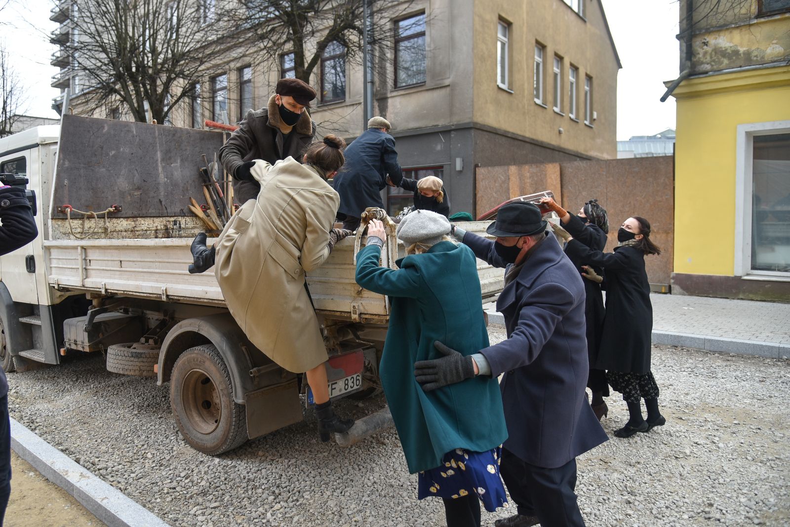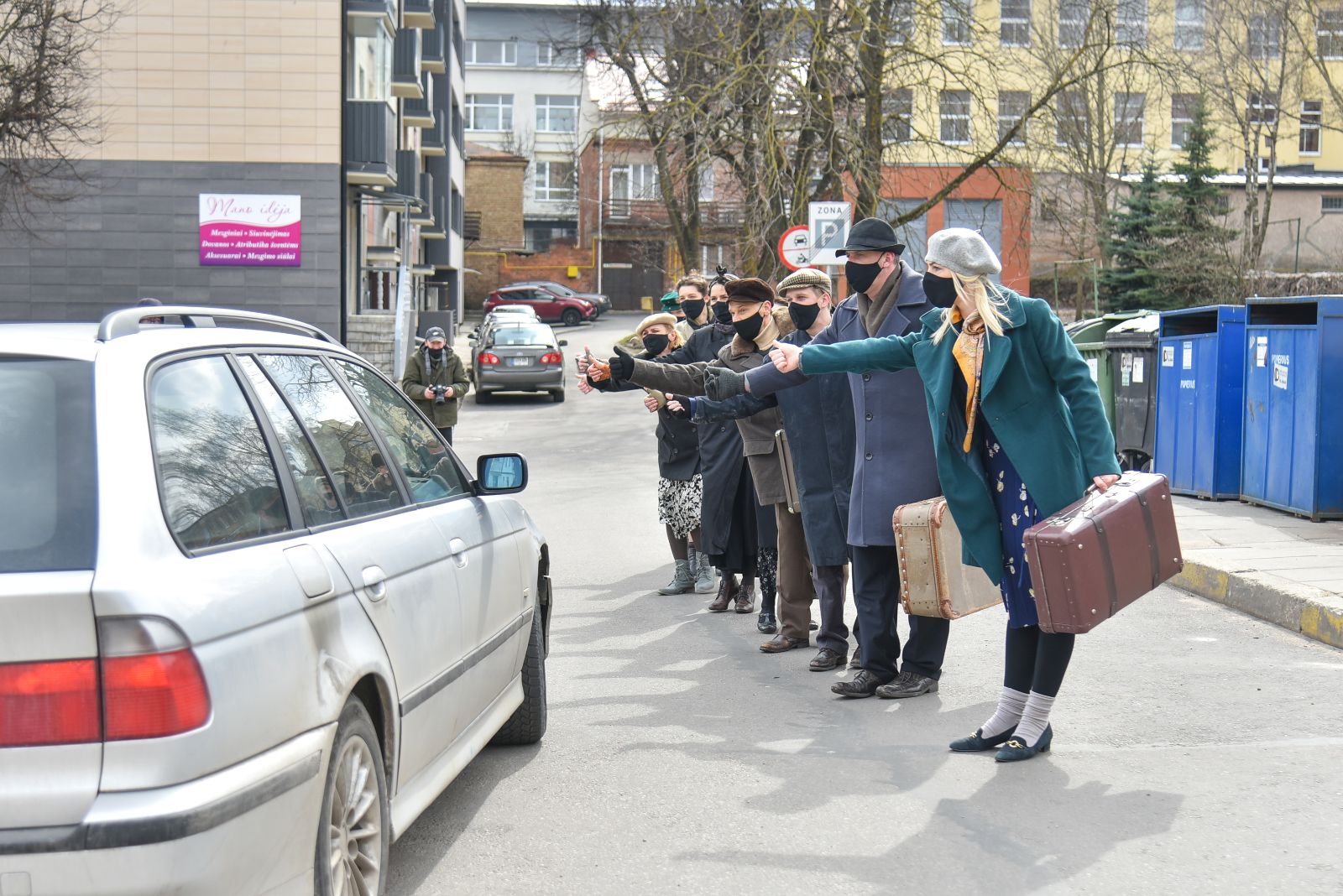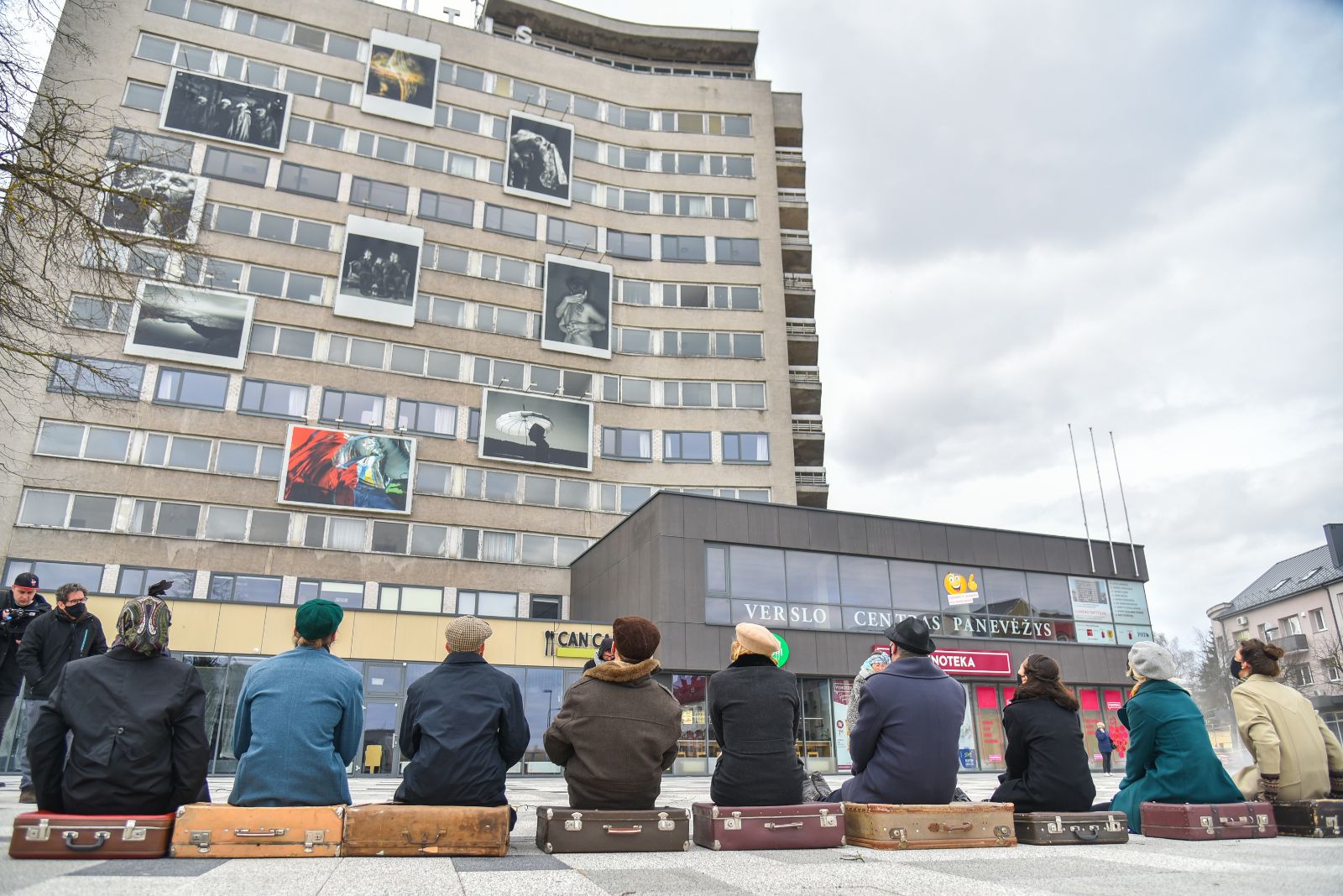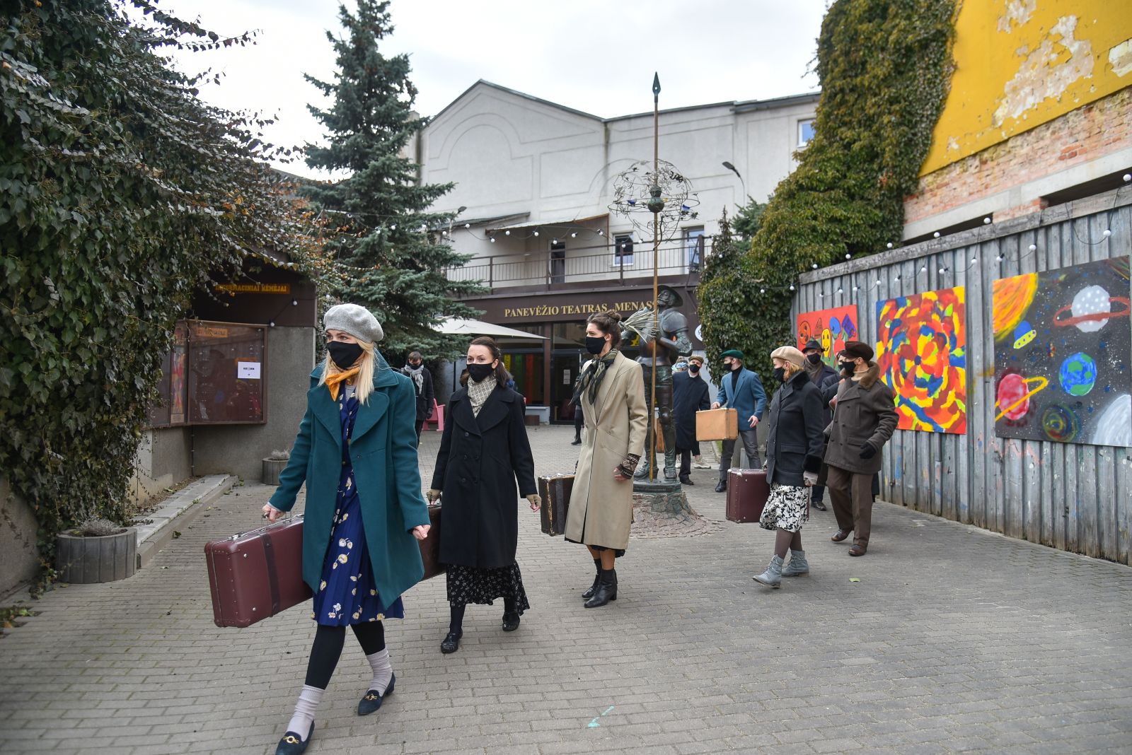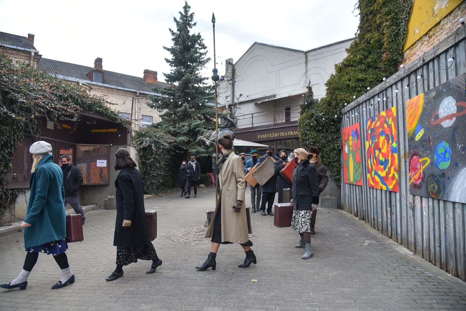 Praėjusio amžiaus šeštojo dešimtmečio apdarais vilkintys keistuoliai su lagaminais penktadienio popietę Panevėžio centre krėtė staigmenas. Pasikeitusiu Panevėžiu besistebintis, besidžiaugiantis, išdykaujantis paltuotų svečių būrys ne vienam sutiktajam kėlė šypseną. Tik nežinia, ką turėjo pagalvoti sunkvežimiu į remontuojamą Vasario 16-osios gatvę atriedėję kelininkai, kai staiga sustabdę jų mašiną tie keistuoliai tarsi niekur nieko sulipo į jos priekabą. Laisvės aikštėje gaudė balandžius, plyteles klojančių darbininkų prašė tylos.