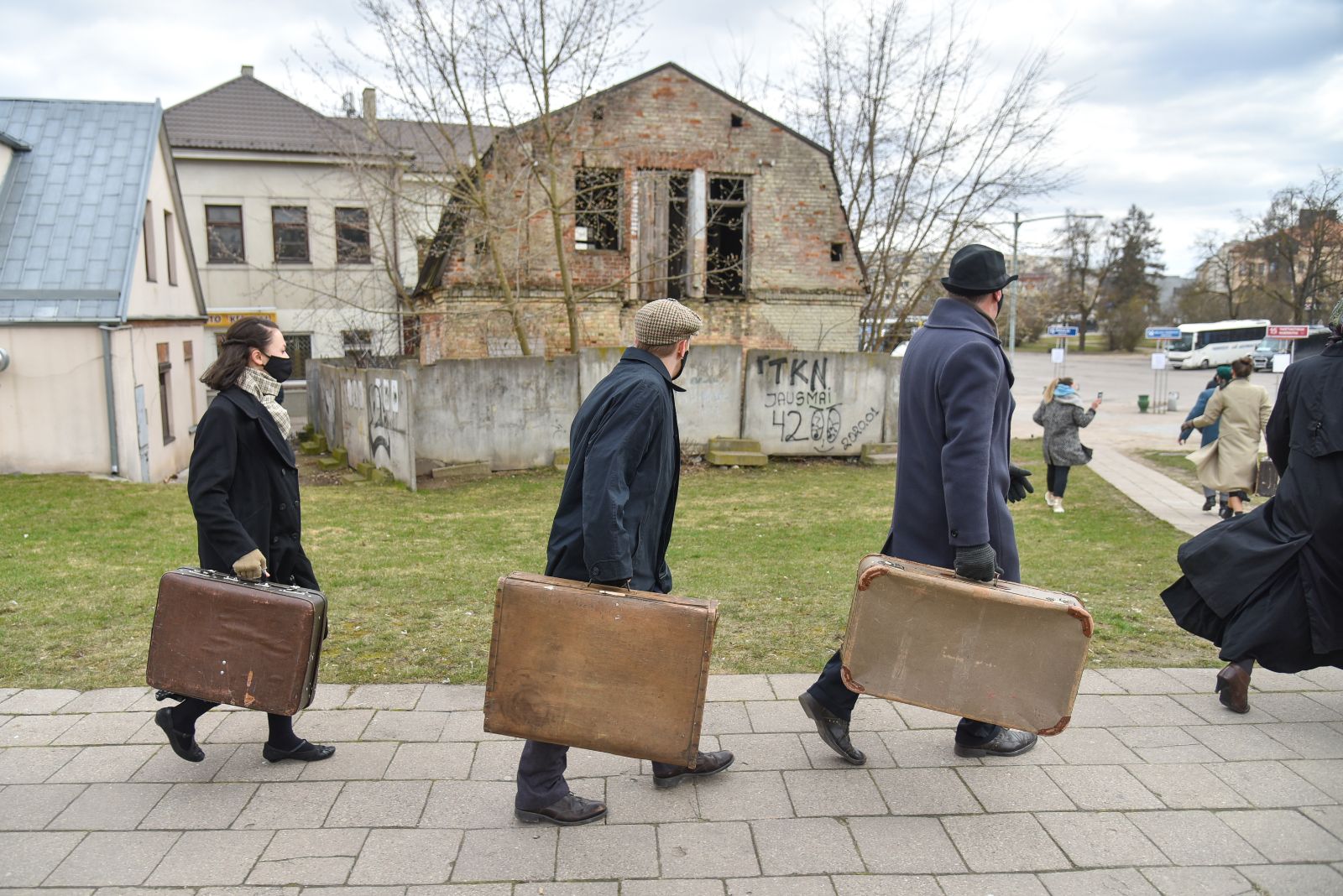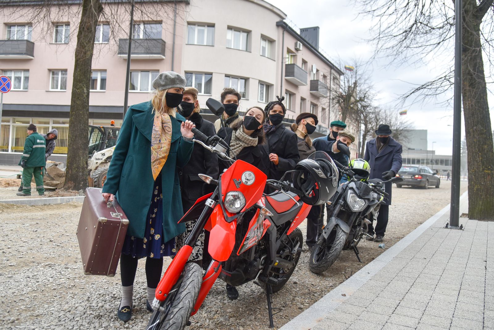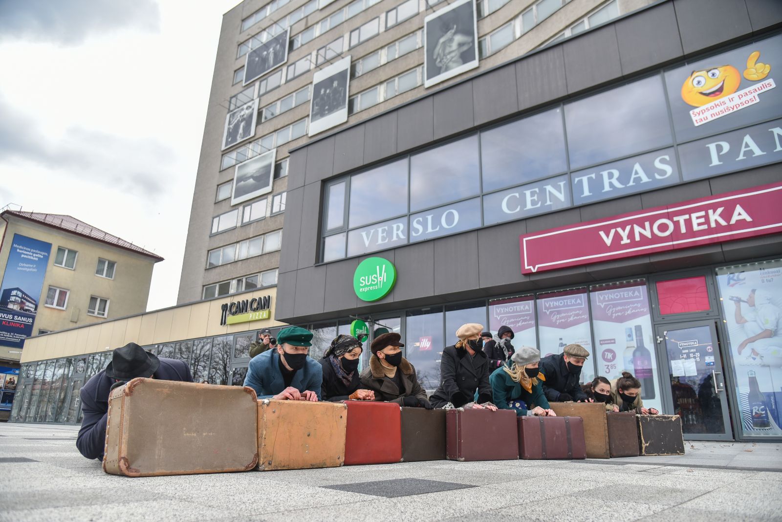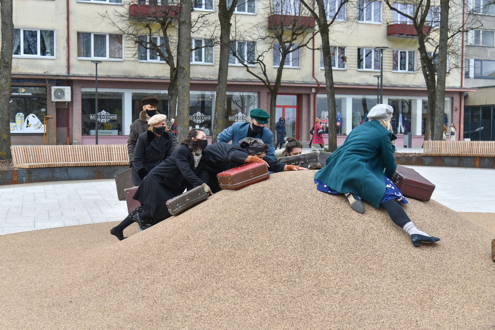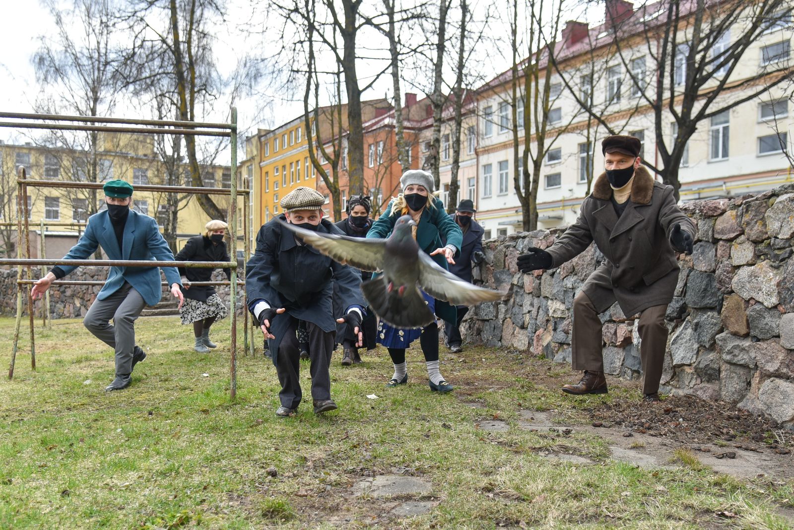 Praėjusio amžiaus šeštojo dešimtmečio apdarais vilkintys keistuoliai su lagaminais penktadienio popietę Panevėžio centre krėtė staigmenas. Pasikeitusiu Panevėžiu besistebintis, besidžiaugiantis, išdykaujantis paltuotų svečių būrys ne vienam sutiktajam kėlė šypseną. Tik nežinia, ką turėjo pagalvoti sunkvežimiu į remontuojamą Vasario 16-osios gatvę atriedėję kelininkai, kai staiga sustabdę jų mašiną tie keistuoliai tarsi niekur nieko sulipo į jos priekabą. Laisvės aikštėje gaudė balandžius, plyteles klojančių darbininkų prašė tylos.