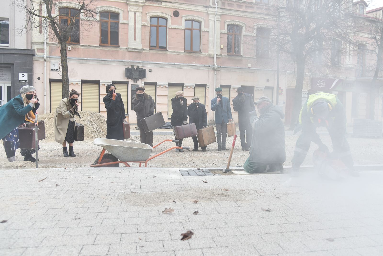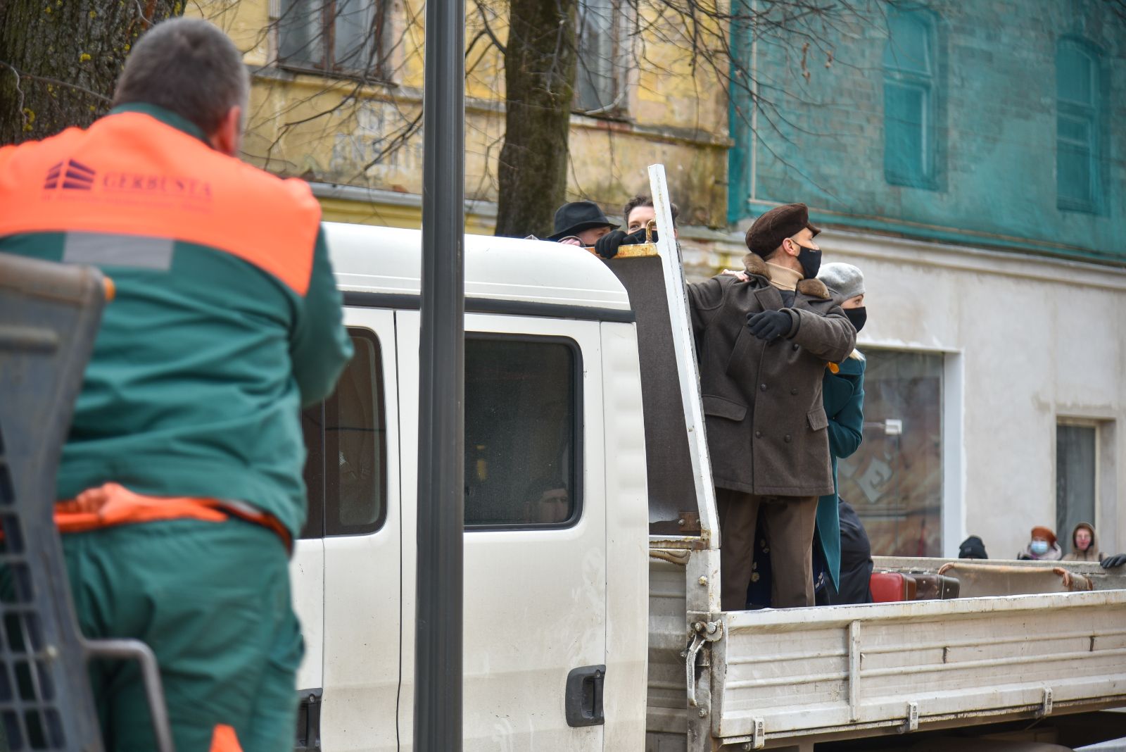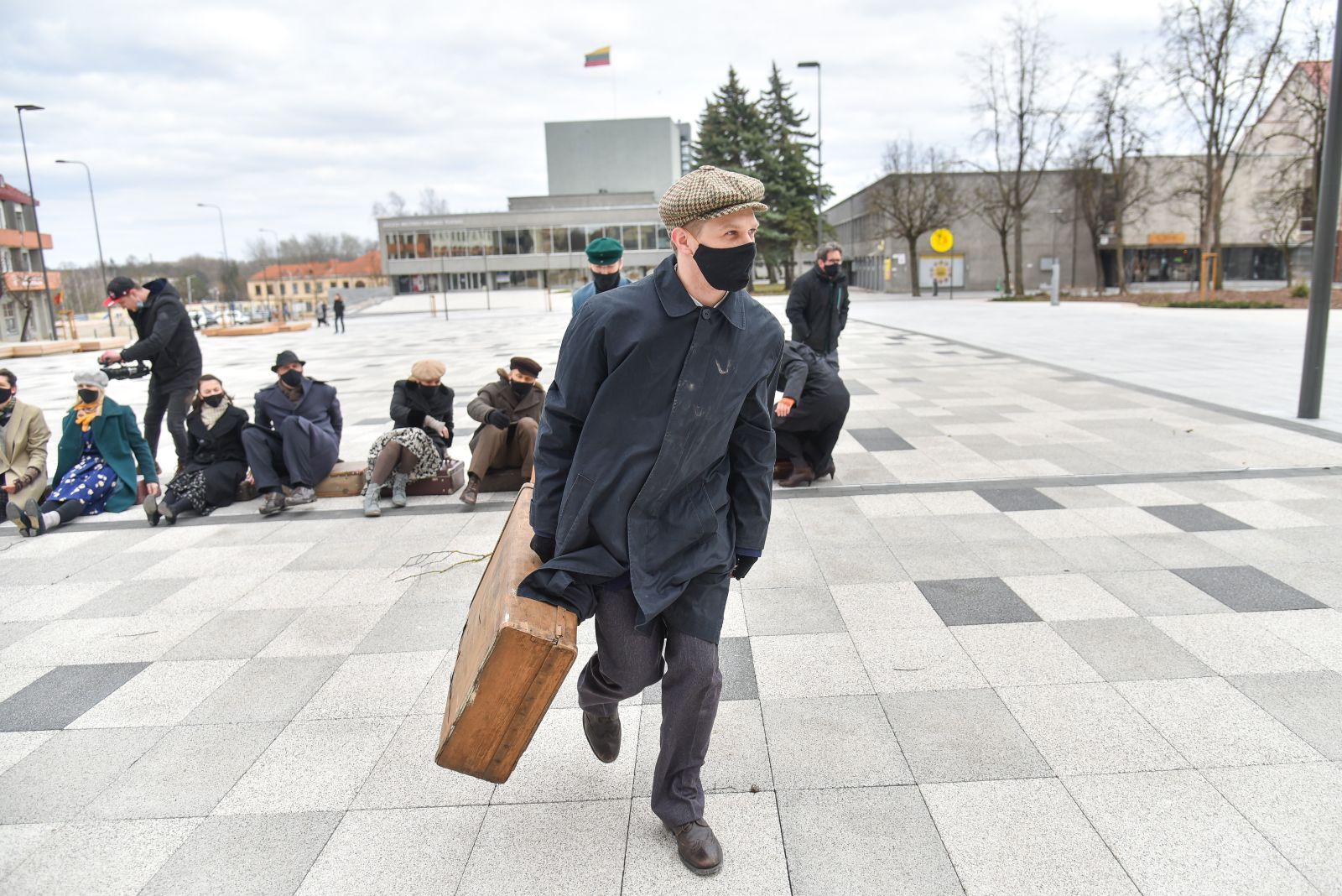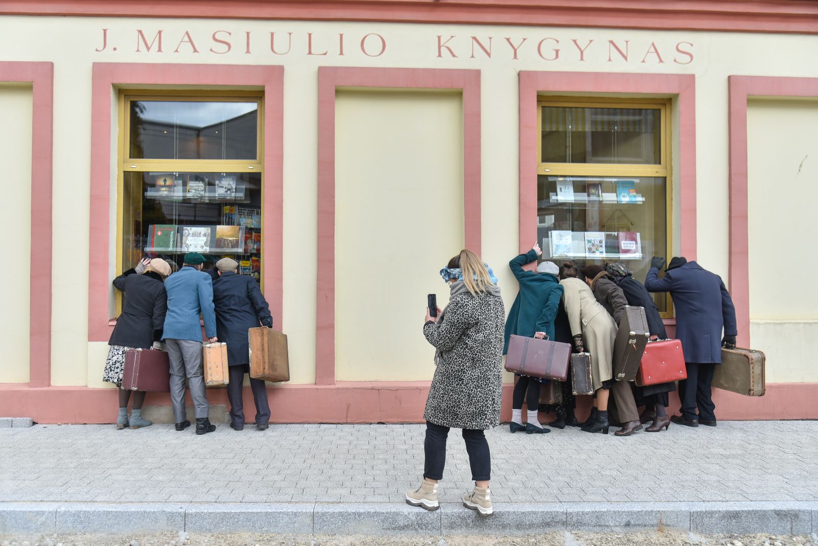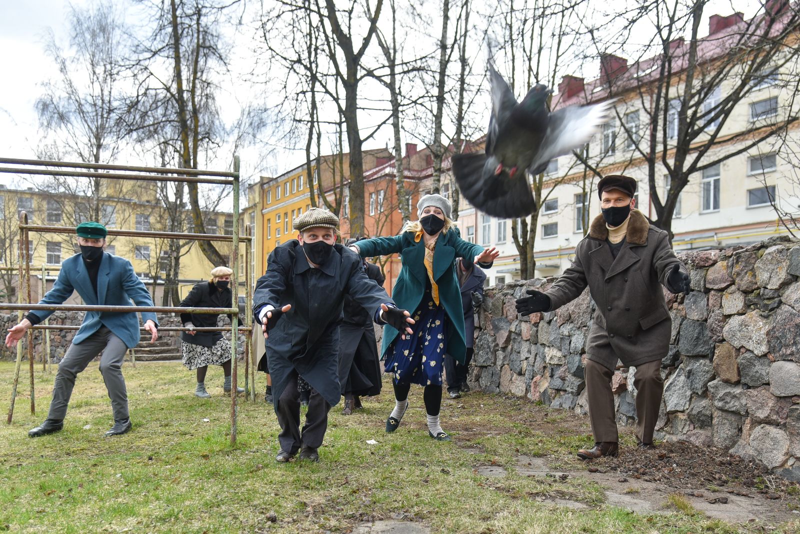 Praėjusio amžiaus šeštojo dešimtmečio apdarais vilkintys keistuoliai su lagaminais penktadienio popietę Panevėžio centre krėtė staigmenas. Pasikeitusiu Panevėžiu besistebintis, besidžiaugiantis, išdykaujantis paltuotų svečių būrys ne vienam sutiktajam kėlė šypseną. Tik nežinia, ką turėjo pagalvoti sunkvežimiu į remontuojamą Vasario 16-osios gatvę atriedėję kelininkai, kai staiga sustabdę jų mašiną tie keistuoliai tarsi niekur nieko sulipo į jos priekabą. Laisvės aikštėje gaudė balandžius, plyteles klojančių darbininkų prašė tylos.
