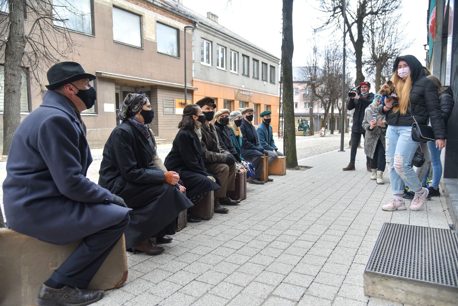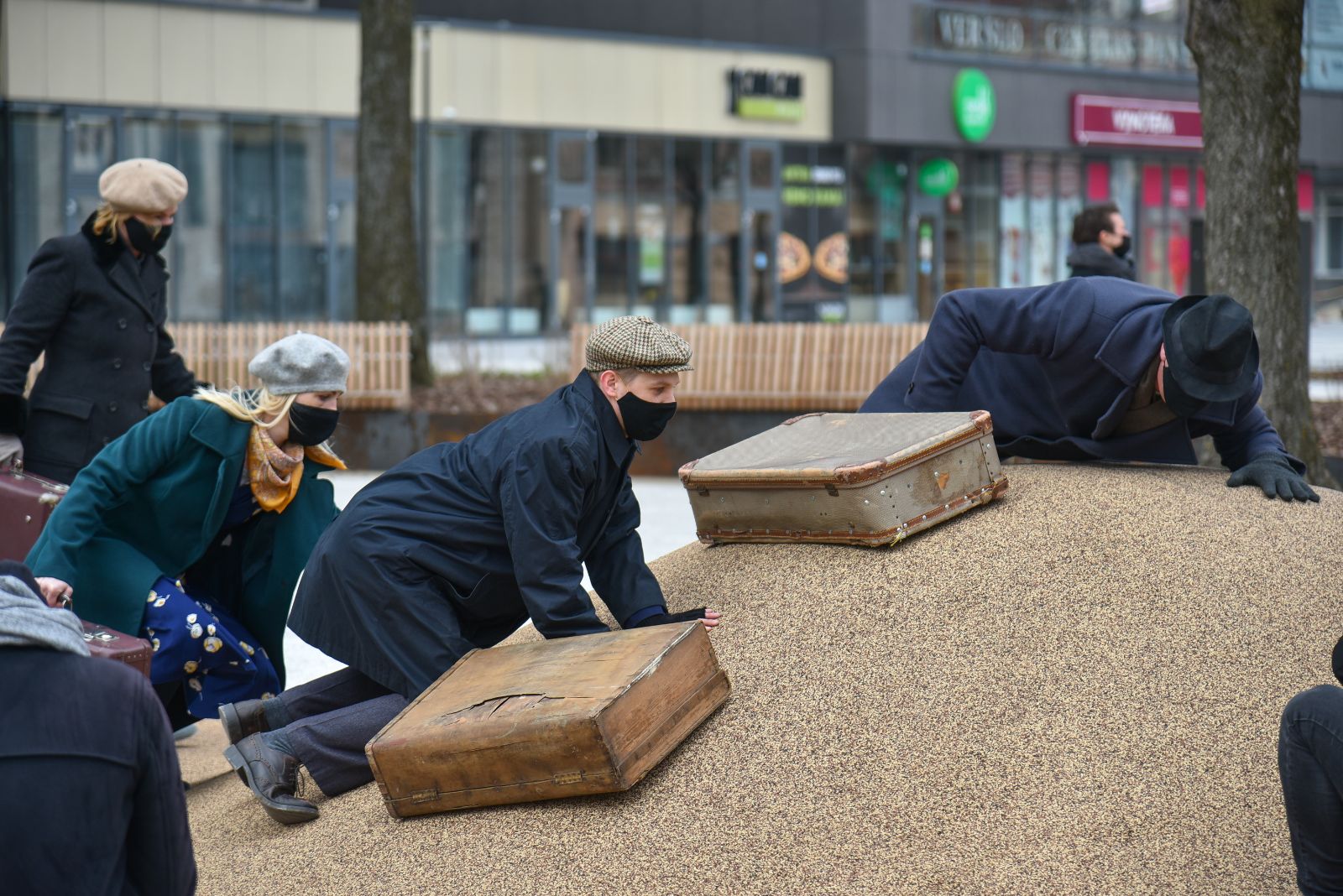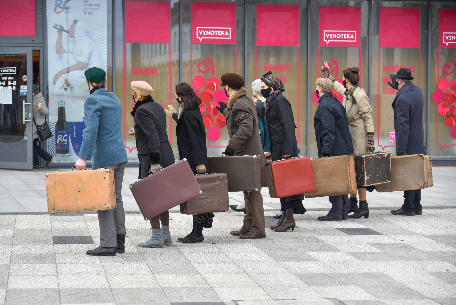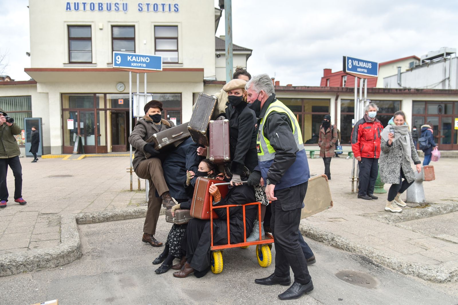 Praėjusio amžiaus šeštojo dešimtmečio apdarais vilkintys keistuoliai su lagaminais penktadienio popietę Panevėžio centre krėtė staigmenas. Pasikeitusiu Panevėžiu besistebintis, besidžiaugiantis, išdykaujantis paltuotų svečių būrys ne vienam sutiktajam kėlė šypseną. Tik nežinia, ką turėjo pagalvoti sunkvežimiu į remontuojamą Vasario 16-osios gatvę atriedėję kelininkai, kai staiga sustabdę jų mašiną tie keistuoliai tarsi niekur nieko sulipo į jos priekabą. Laisvės aikštėje gaudė balandžius, plyteles klojančių darbininkų prašė tylos.