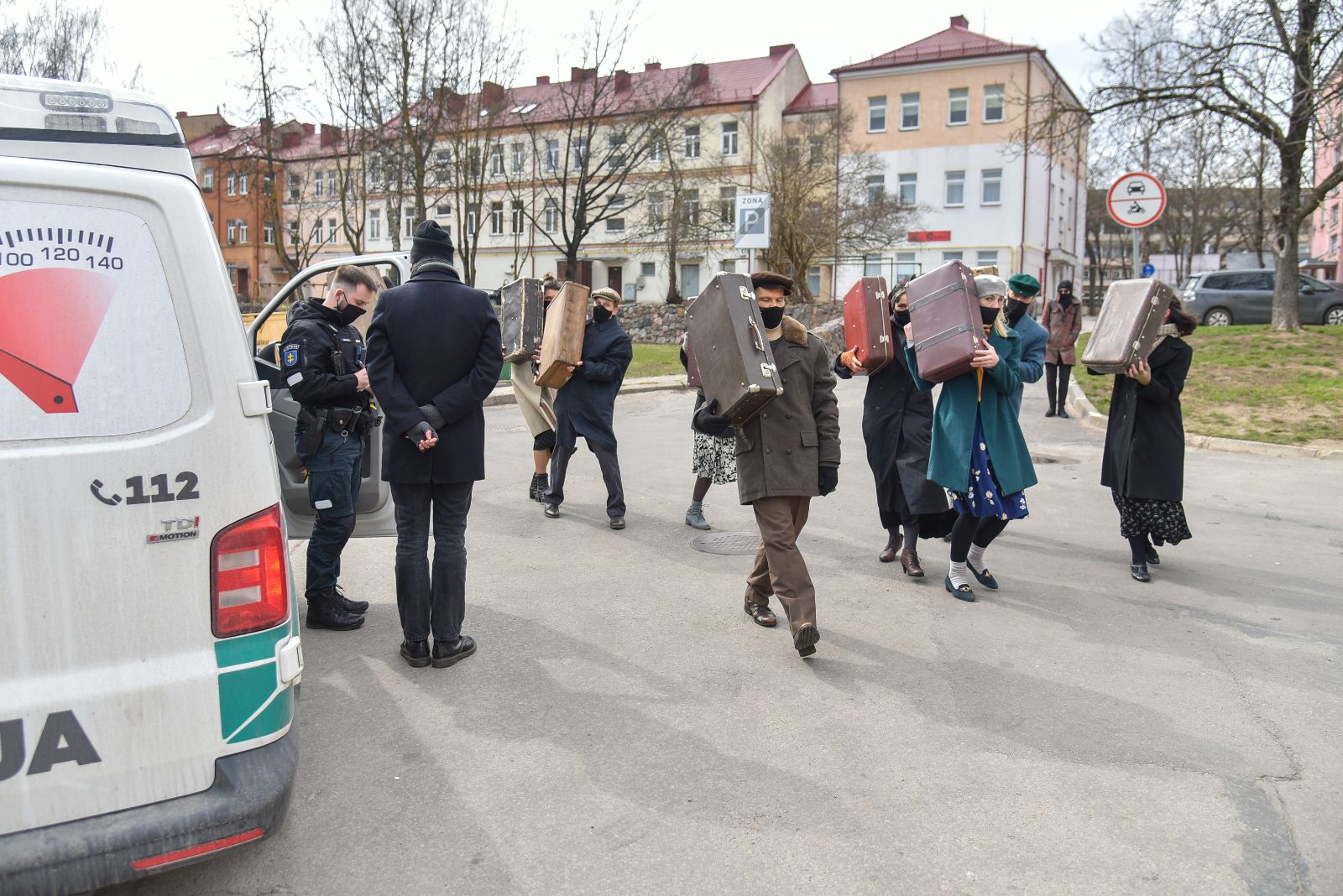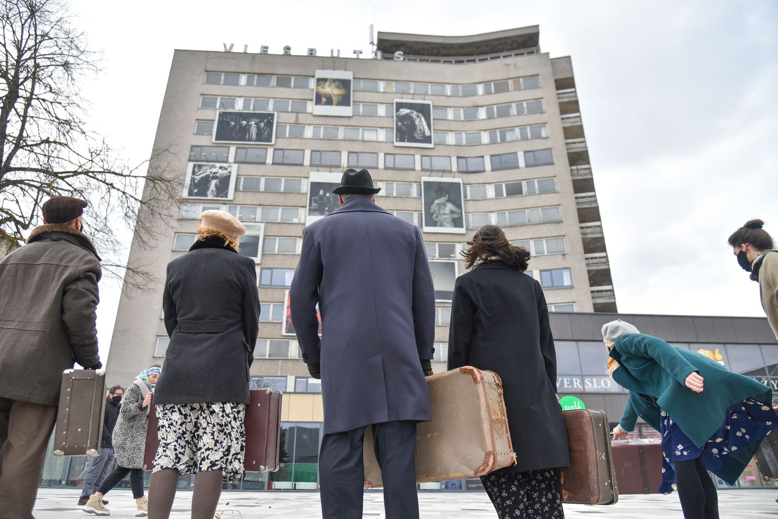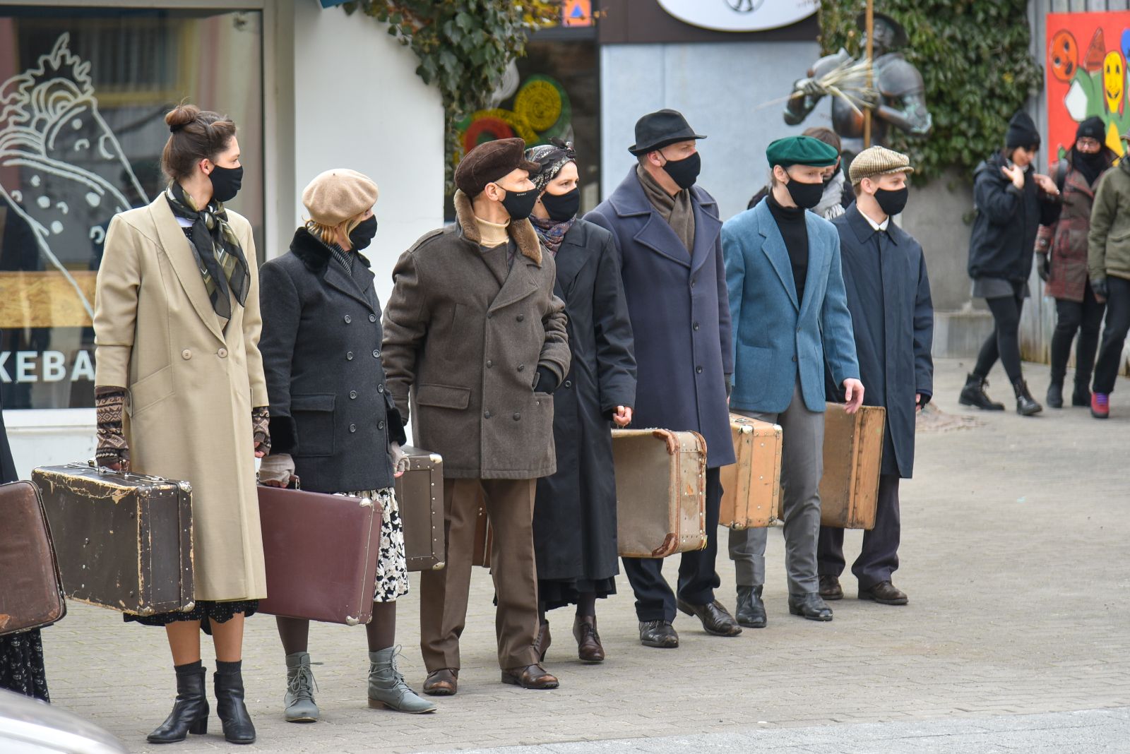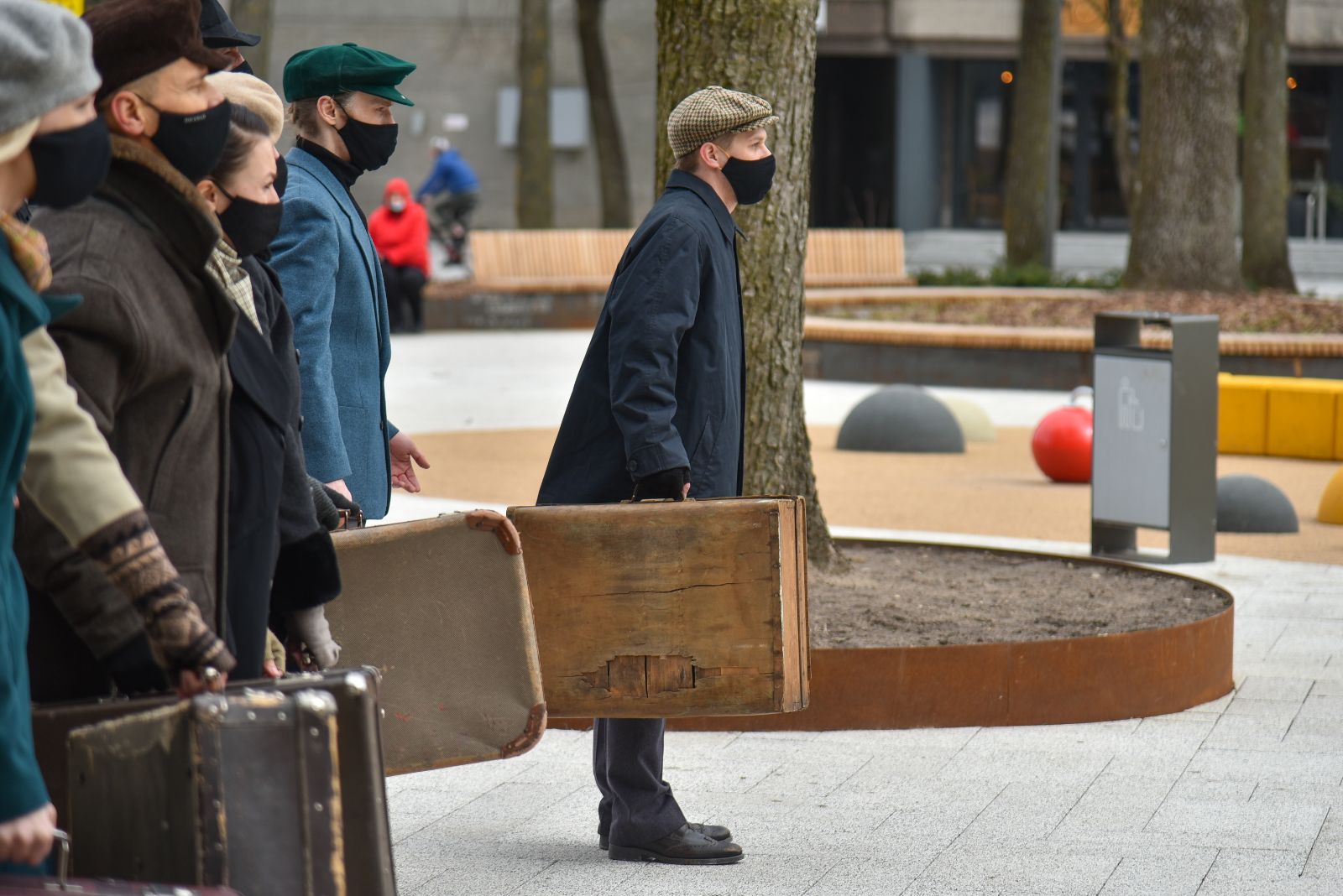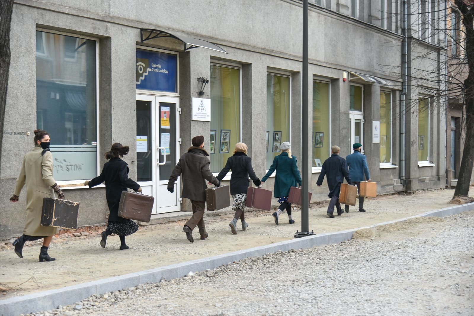 Praėjusio amžiaus šeštojo dešimtmečio apdarais vilkintys keistuoliai su lagaminais penktadienio popietę Panevėžio centre krėtė staigmenas. Pasikeitusiu Panevėžiu besistebintis, besidžiaugiantis, išdykaujantis paltuotų svečių būrys ne vienam sutiktajam kėlė šypseną. Tik nežinia, ką turėjo pagalvoti sunkvežimiu į remontuojamą Vasario 16-osios gatvę atriedėję kelininkai, kai staiga sustabdę jų mašiną tie keistuoliai tarsi niekur nieko sulipo į jos priekabą. Laisvės aikštėje gaudė balandžius, plyteles klojančių darbininkų prašė tylos.