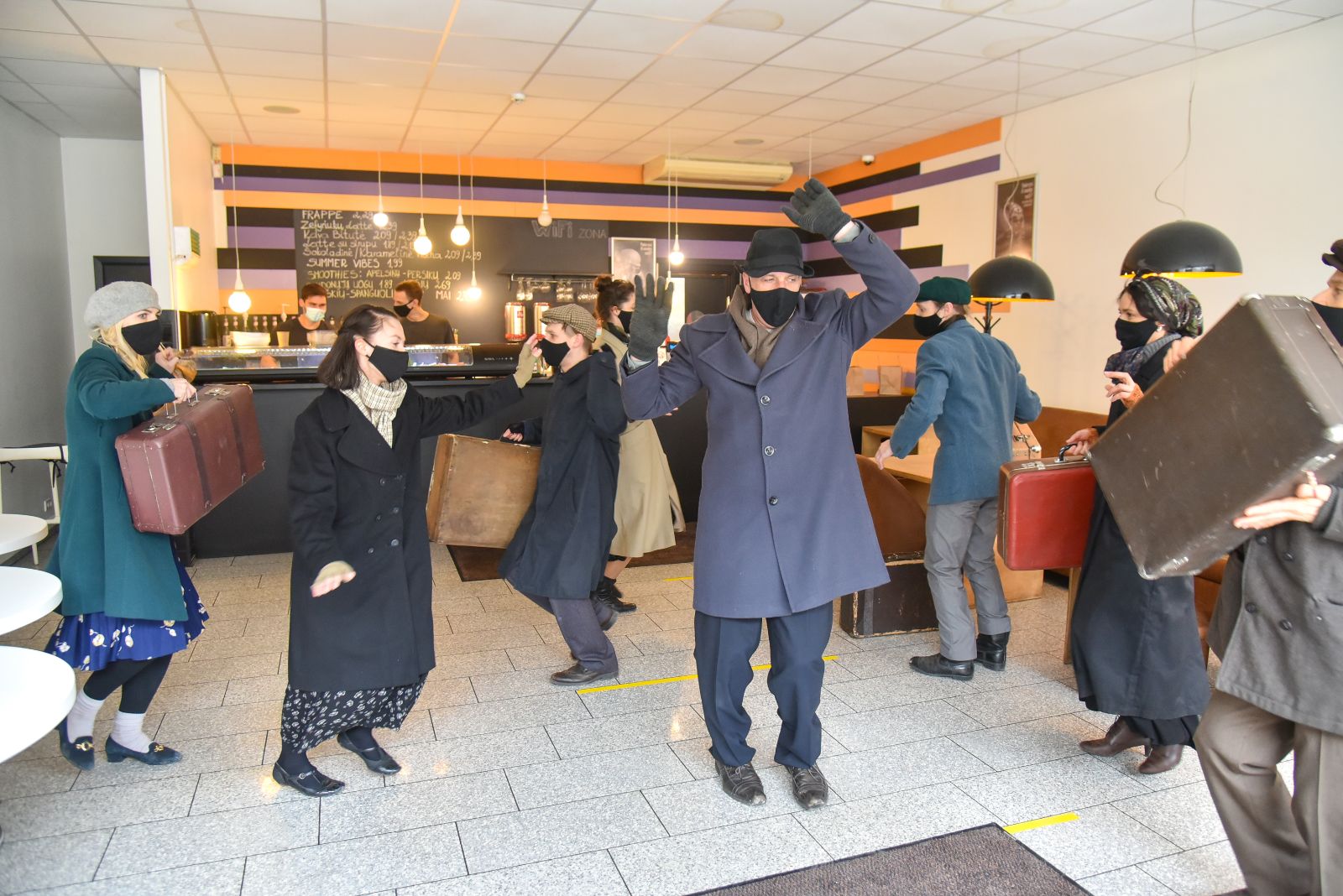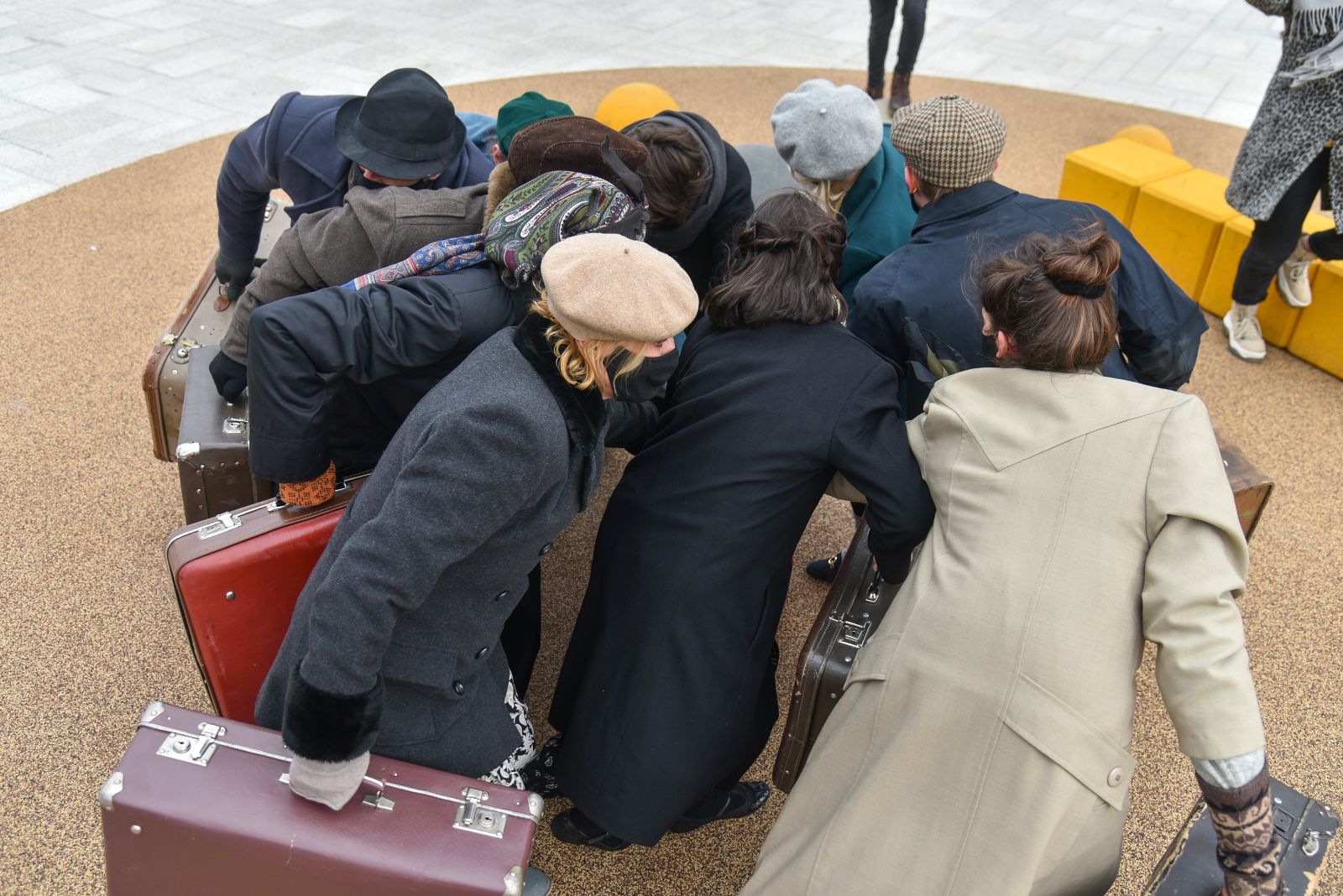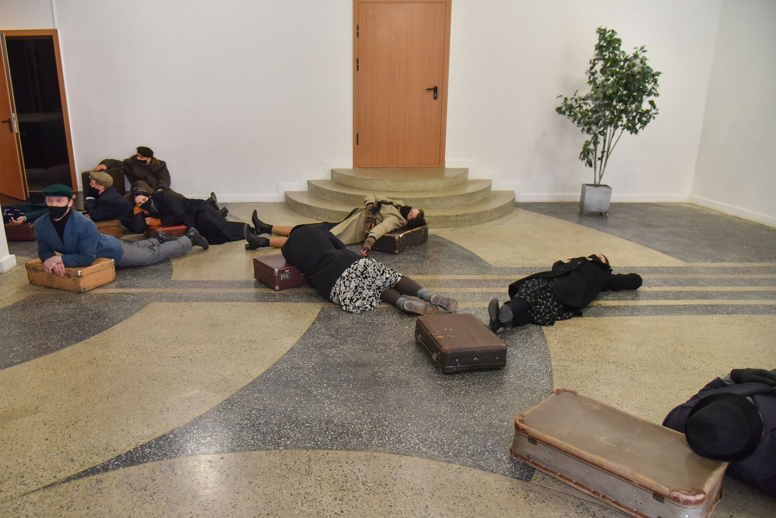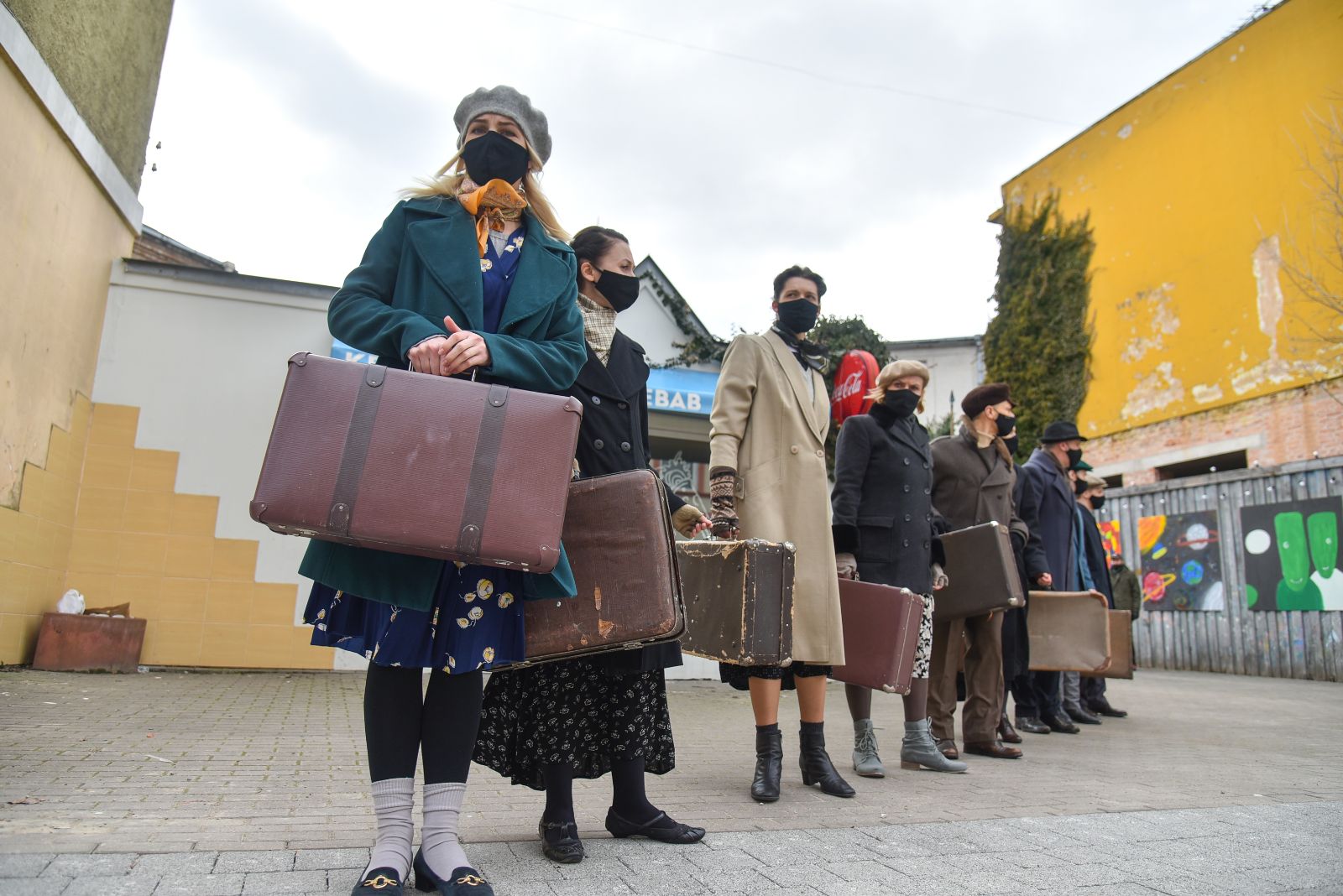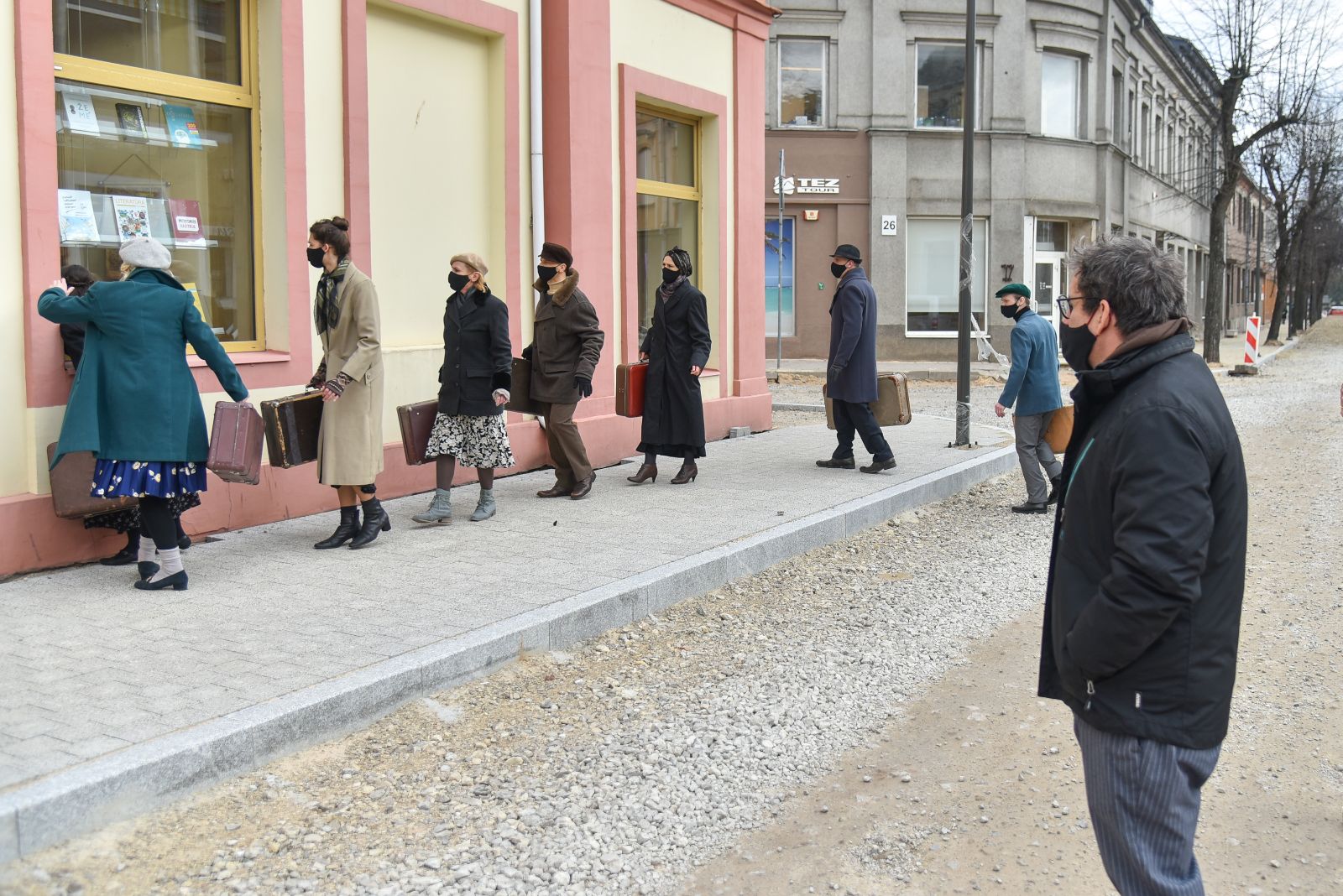 Praėjusio amžiaus šeštojo dešimtmečio apdarais vilkintys keistuoliai su lagaminais penktadienio popietę Panevėžio centre krėtė staigmenas. Pasikeitusiu Panevėžiu besistebintis, besidžiaugiantis, išdykaujantis paltuotų svečių būrys ne vienam sutiktajam kėlė šypseną. Tik nežinia, ką turėjo pagalvoti sunkvežimiu į remontuojamą Vasario 16-osios gatvę atriedėję kelininkai, kai staiga sustabdę jų mašiną tie keistuoliai tarsi niekur nieko sulipo į jos priekabą. Laisvės aikštėje gaudė balandžius, plyteles klojančių darbininkų prašė tylos.