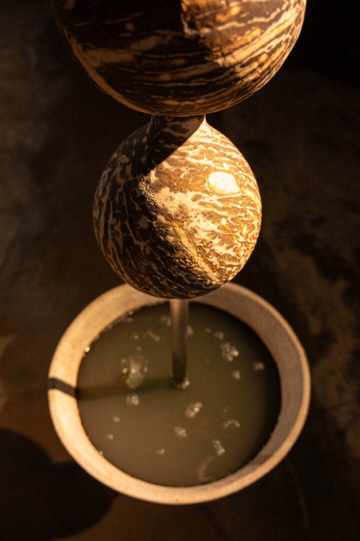 Man labai svarbu, kad skysčiai yra gyvi, norėjau parodyti vandens gyvumą: vyksta fermentacijos, rūgimo procesai, jie reaguoja su rezervuaro aplinka, su pačiu keraminiu indu. Parodoje yra du fontanai, užpildyti mano gamintu rūgštiniu skysčiu, kuris reaguoja su metalais, indais, tad kuriasi naujos jungtis: kristalizacijos procesai, indų išėdimas. Įdomu tai, jog kai užpildžiau fontanus skysčiu, tiek skaidrus balsvas skystis, tiek fontanai pajuodavo – nauja cheminė jungtis.