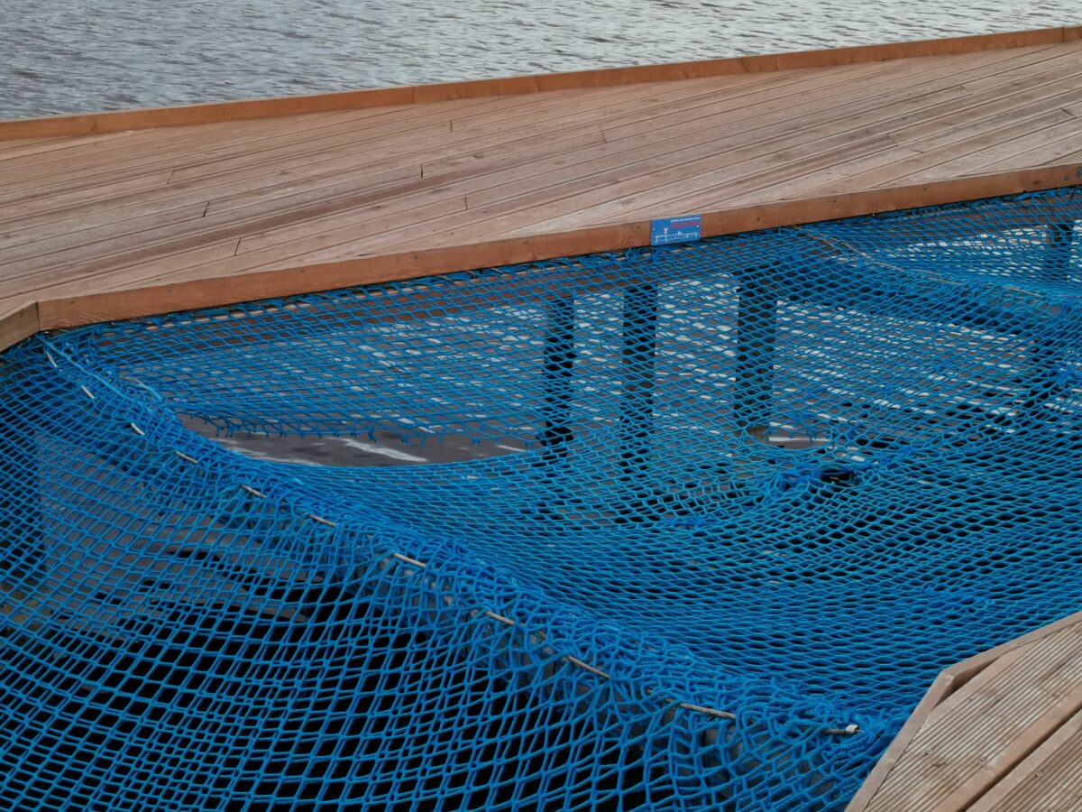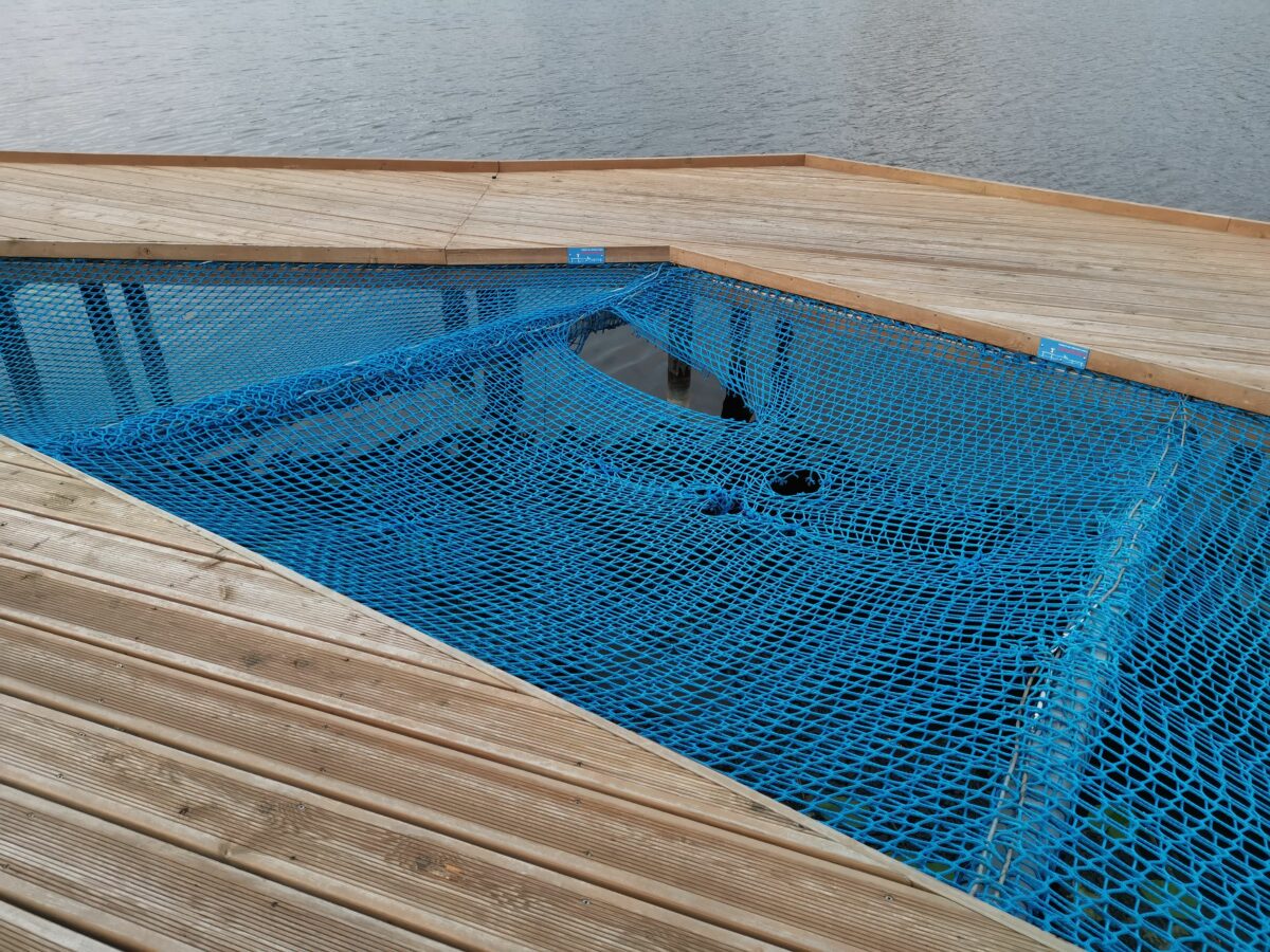 Ramiam poilsiui skirtas medinėje terasoje įmontuotas tinklas virš vandens šį sezoną graso nelaime – infrastruktūros prižiūrėtojai nespėja lopyti jame vis atsiveriančių skylių.