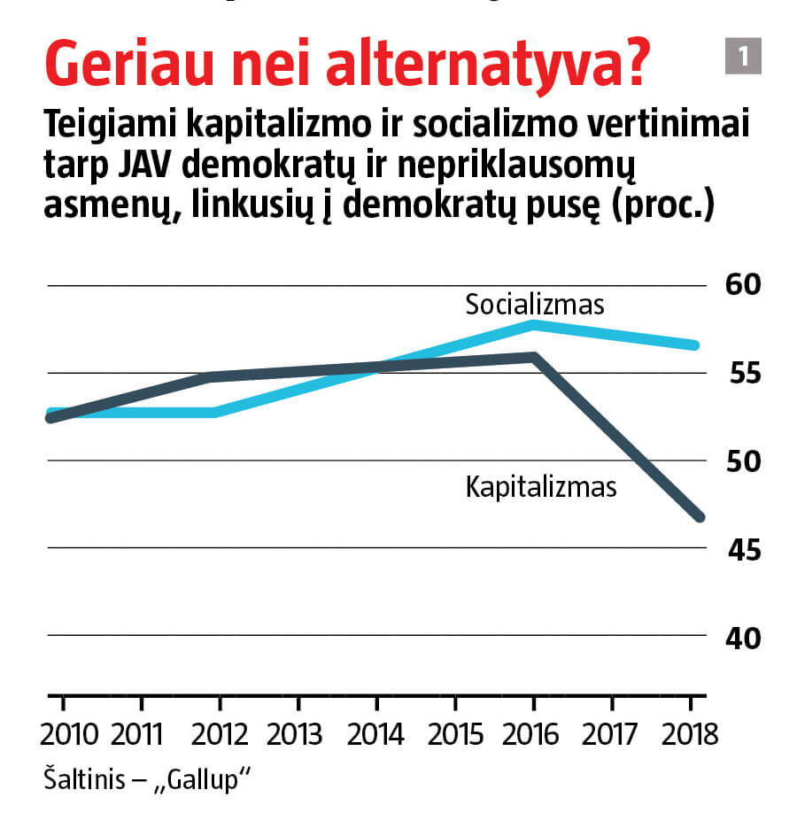 Žlugus SSRS užaugę amerikiečiai socializmo nebelaiko tokiu baubu kaip ankstesnės kartos. Kairėje daug amerikiečių į kapitalizmą ėmė žiūrėti gerokai skeptiškiau (žr. 1 grafiką). Tai, ką galima pavadinti „tūkstantmečio kartos socializmu“, išgyvena savotišką kultūrinį momentą. Pas modernius, jaunus ir socialiai sąmoningus ant stalelių rasi tokius leidinius kaip „Jacobin“ ir „Tribune“. Joks kitas filmas profsąjungų nepavaizdavo šauniau nei pernykštis „Sorry To Bother You“ („Atsiprašau, kad trukdau“), sukurtas ir režisuotas reperio ir aktyvisto Bootso Riley. Britų TV laidų vedėjui Piersui Morganui nepatikėjus, kad jaunoji jo pašnekovė iš kitos kairės nei Barackas Obama, jos atsakymas netruko atsidurti ant marškinėlių: „Aš realiai tikra komunistė, idiote tu.“