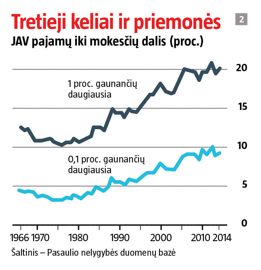 Atmetus šitai, užkietėjusių socialistų JAV politinėje klasėje dar reta. Tačiau A. Ocasio-Cortez ar B. Sandersui prabilus, kad reikia radikalių permainų, dėl pastarųjų trisdešimties metų nusivylimų ir žalos jų žodžiai pasiekia įvairių mažiau radikalių, bet vis tiek iliuzijas praradusių kairiųjų širdis. Tie žmonės matė, kaip trečiojo kelio lyderiai rėmė klaidingomis prielaidomis pagrįstus užsienio karus, o neva sveiką ūkį ištiko finansų krizė. Jiems atrodo, kad auganti ekonomika iš esmės pasitarnavo tik turtuoliams (žr. 2 grafiką), o ideologijos nulemtas išlaidų mažinimas buvo nutaikytas į nepasiturinčius. Juos piktina niekam neatsiskaitantis pasaulio elitas, jiems bežiūrint šokinėjantis iš verslo į politiką ir atgal, kai veriasi vis didesnė ekonominė nelygybė (nors viskas daug sudėtingiau – žr. 3 grafiką). Donaldas Trumpas Baltuosiuose rūmuose – jų nepasitenkinimo akcentas, kaip ir didėjant pasauliniam BVP nekontroliuojamai auganti anglies dioksido emisija, daugelio jaunų žmonių matoma kaip grėsmė jų ateičiai.