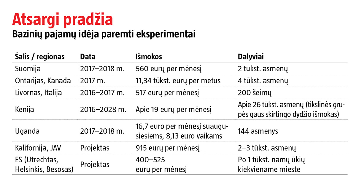 „Swedbank“ vyriausiasis ekonomistas Nerijus Mačiulis pernai apskaičiavo, kad mūsų šalis galėtų sau leisti išdalyti po 200 eurų kiekvienam gyventojui. Šis sprendimas leistų sumažinti socialinės apsaugos biurokratiją, kuri nemenką dalį lėšų sunaudoja pašalpoms administruoti. Toks bazinių pajamų eksperimentas per mėnesį kainuotų 560 mln., per metus – 6,7 mlrd. eurų. Politikai rimtai N. Mačiulio idėjos nesvarstė.