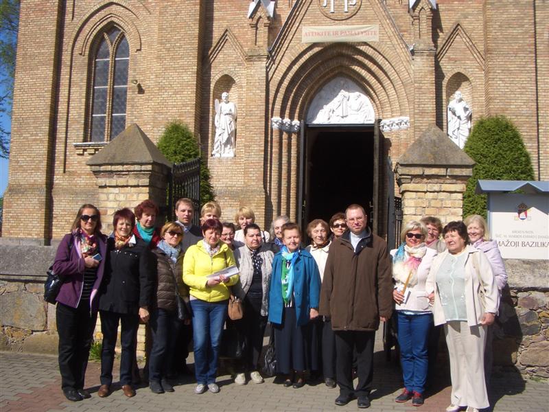 Įsiamžiname bendroje nuotraukoje. Gerb. klebonas G. Jankūnas išlydėdamas kiekvienam, kopiančiam į autobusą, paspaudžia ranką, palinki geros kelionės. Grįždami užsukame į Krekenavos regioninį parką, aplankome Ramygalą ir kiek ilgiau užtrunkame Linkaučių kaime netoli Truskavos. Čia Zofijos Milinienės, Elenos Malūnavičienės sesers, sodyboje buvome šiltai sutikti. Prie pavėsinėje įrengto altorėlio kaimo giesmininkės su monsinjoru Algirdu Jurevičiumi surengė gegužines pamaldas Švč. Mergelės Marijos garbei.