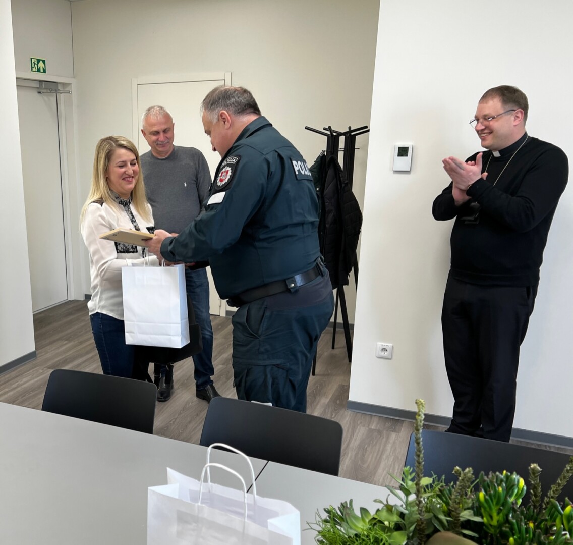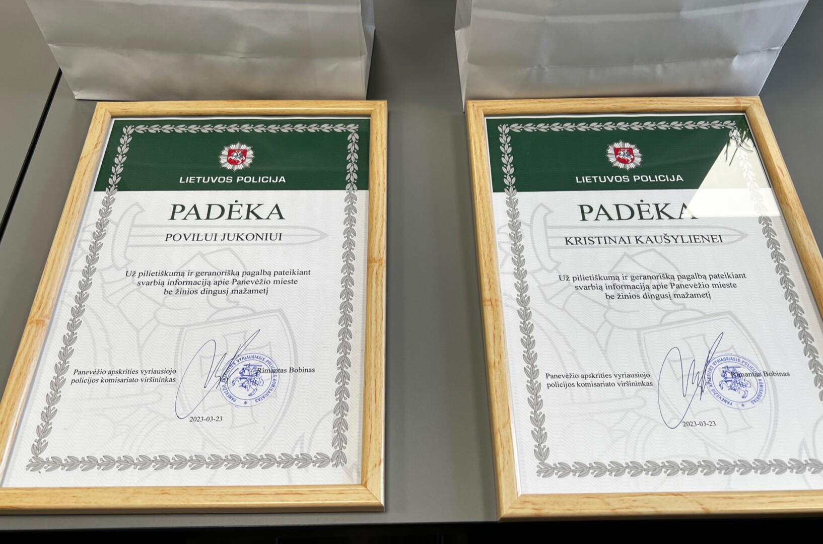 Dviems panevėžiečiams, padėjusiems surasti iš lopšelio-darželio išėjusį šešiametį, įteiktos policijos padėkos.