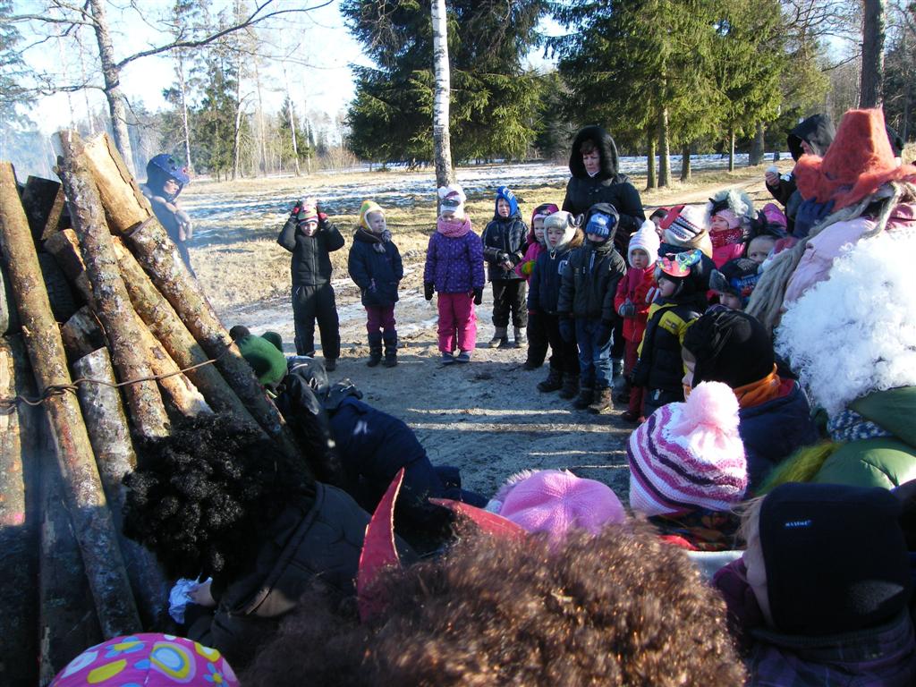 Lašininiui išsliūkinus, auklėtojų virta arbata ir lašinukais vaišinomės gražiai įrengtoje erdvioje girininkijos pavėsinėje. Kalbėjomės apie žiemą ir pavasarį, skaičiavome, kiek kartų jau valgėme, o kiek dar šiandieną teks, nes Užgavėnių dieną reikia pavalgyti sočiai – net dvylika kartų, kad visi metai būtų skalsūs. Prisiminėme, jog prasidėjus gavėniai – rimties ir susikaupimo bei Velykų laukimo metui, turime tapti geresni, todėl Užgavėnių lauže sudeginome atsivežtas „blogybes“.