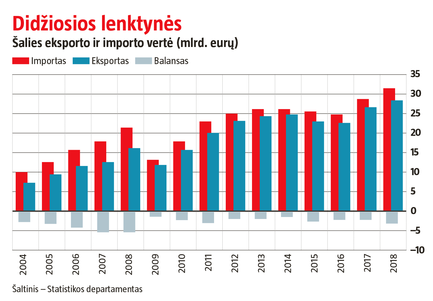 Lietuvoje tarsi įprasta, kad jeigu kas nors skamba gerai, reikia ieškoti „kabliukų“. Vienas jų akivaizdus: nors eksportuojama sėkmingai, prekybos deficitas išlieka neigiamas ir palyginti nemažas – apie 2,6 mlrd. eurų per 2018 m.