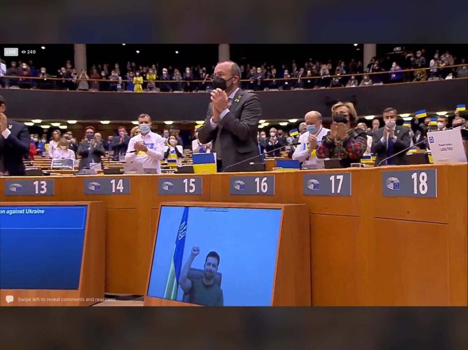 „Europos Sąjunga su mumis bus daug stipresnė. Dėl to nėra abejonių, – kalbėjo V. Zelenskis. – Be jūsų Ukraina bus viena“. Ukraina esą įrodė savo stiprybę. „Įrodykite, kad esate su mumis (…) Įrodykite, kad tikrai esate europiečiai. Tada gyvenimas nugalės karą“.