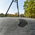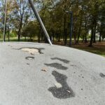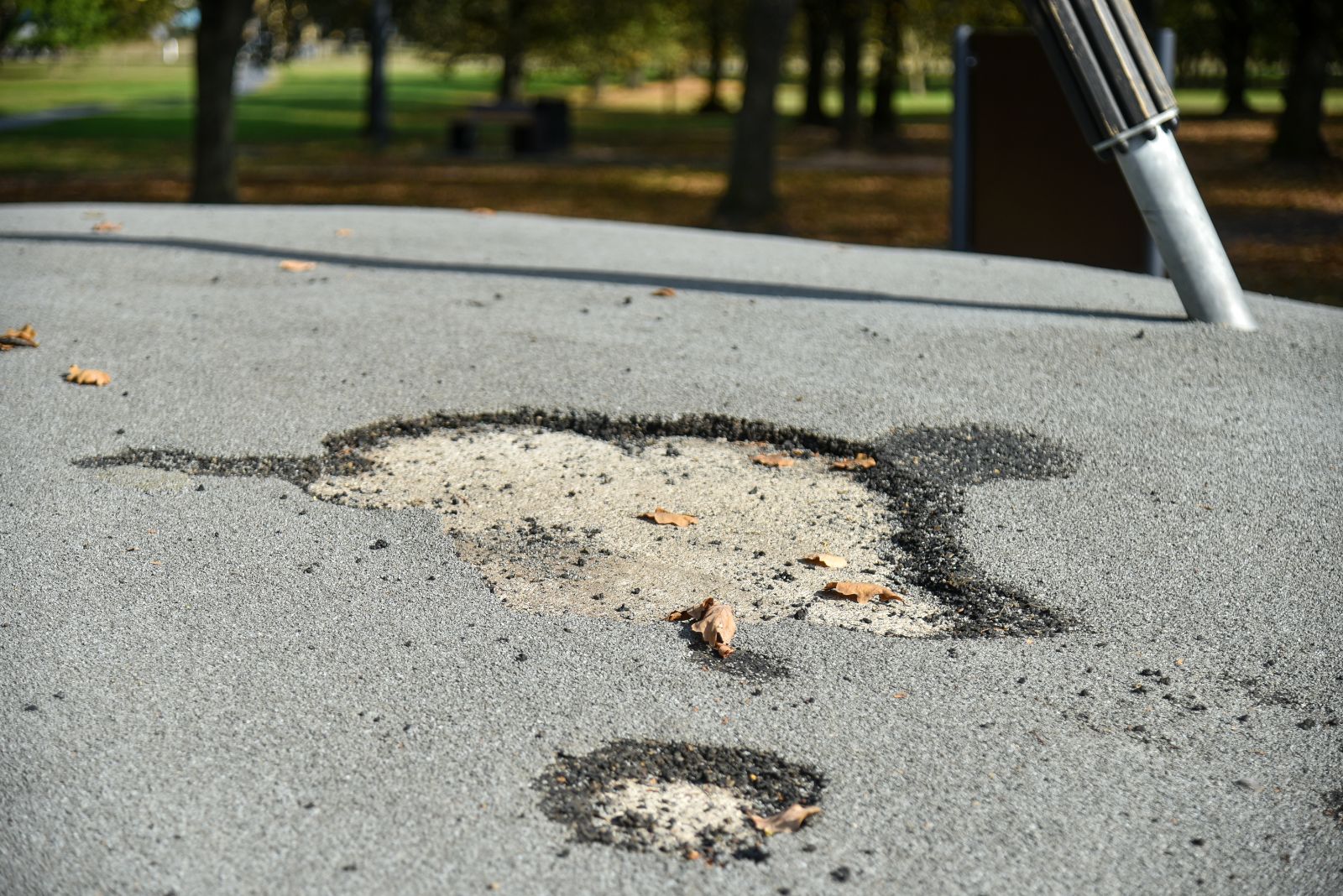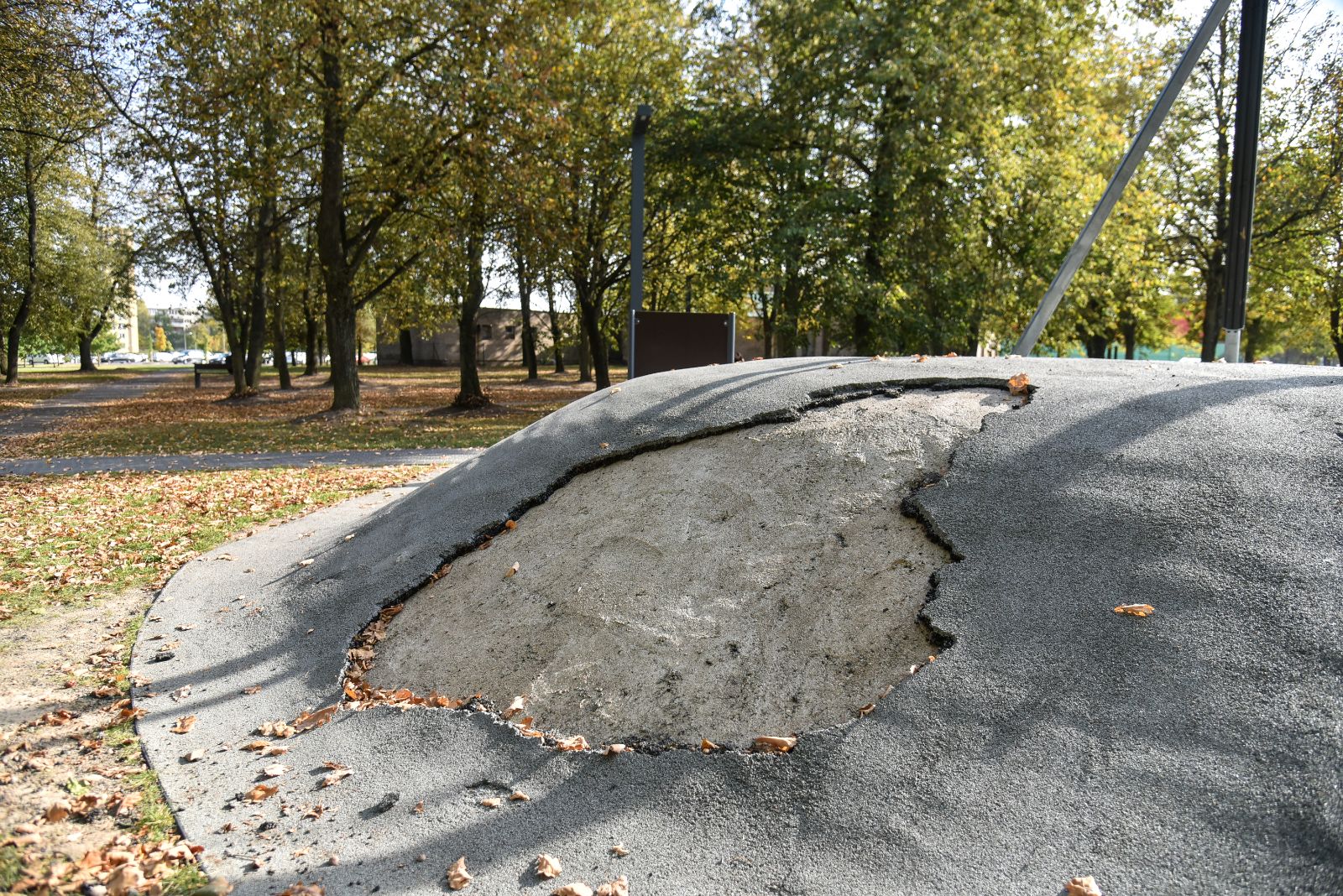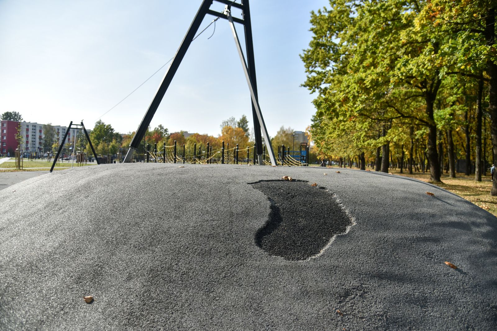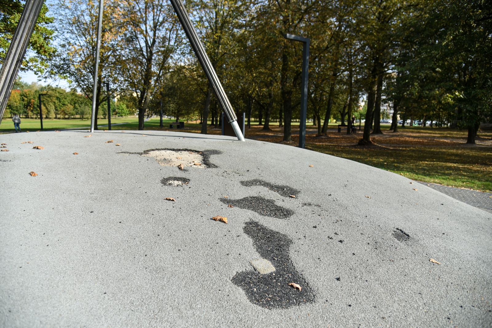 Nuotraukos su apgadinta vaikų žaidimų aikštelės danga išgražėjusiame Panevėžio kultūros ir poilsio parke pirmiausia pasirodė internete šią savaitę. Komentatoriai svarstė, ar čia neseniai atliktų darbų brokas, ar tiesiog piktadariams rankos panižo.