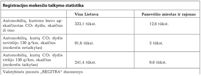 Nuo pernai liepos mėnesio, kai lengviesiems automobiliams buvo pradėtas taikyti registracijos mokestis, iki šių metų birželio pabaigos, „Regitros“ duomenimis, CO2 dydis buvo nustatytas apie 333,1 tūkst. naujų ir naudotų lengvųjų automobilių. Iš jų registracijos mokesčio mokėti nereikėjo kas antram vairuotojui.