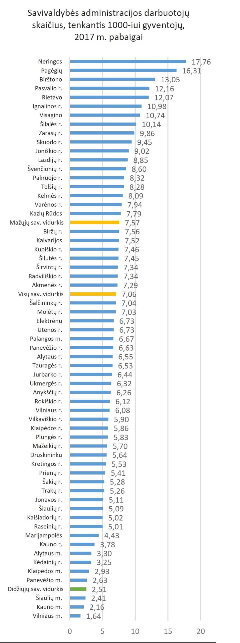 Pavyzdžiui, Panevėžio mieste 1000-iui gyventojų tenka 2,63 Savivaldybės darbuotojo. Ir tai yra vienas iš geriausių rodiklių šalyje. Mažiau valdininkų nei Aukštaitijos sostinėje 1000-iui gyventojui tenka Vilniaus, Kauno ir Šiaulių savivaldybėse – atitinkamai nuo 1,64 iki 2,41. Daugiausia darbuotojų (17,76) tūkstančiui gyventojų – lietuviškame turistų svajonių kampelyje Neringoje.