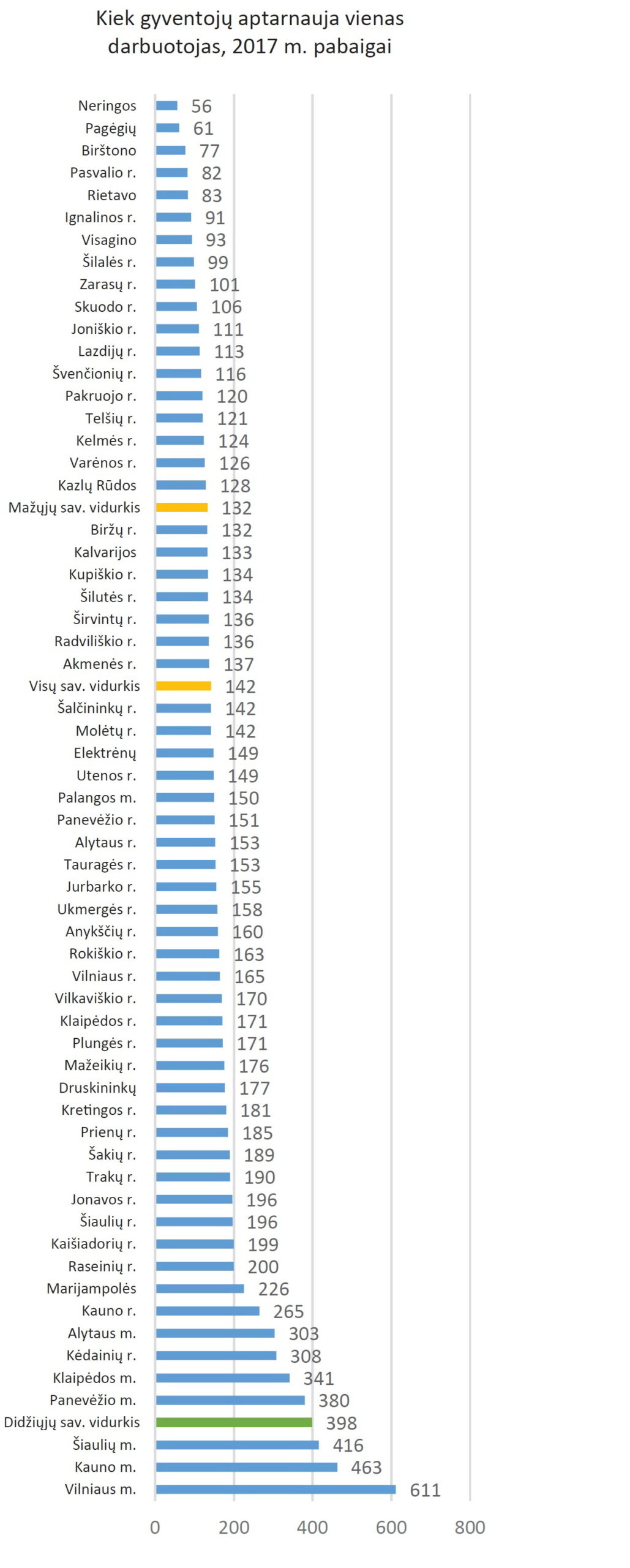 Mažiausiai darbo turėjo Neringos, Pagėgių, Birštono ir Pasvalio savivaldybių administracijų darbuotojai – nuo 56 iki 82 interesantų vienam valdininkui. Panevėžio rajono savivaldybėje vienas administracijos darbuotojas aptarnauja 151 gyventoją.