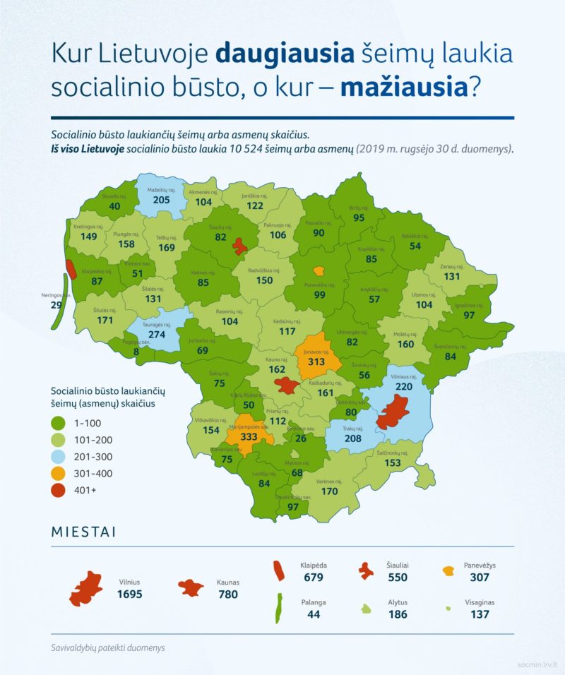 Daugiau nei Aukštaitijos sostinėje socialiai remtinųjų, laukiančių būstų, yra Jonavos rajone, Marijampolėje bei keturiuose didžiuosiuose miestuose. Daugiausia – beveik 1700 – pastogės neturinčiųjų suskaičiuojama Vilniuje. Trumpiausia eilė prie socialinių būstų raktų – Birštone (26) ir Skuodo rajone (40).