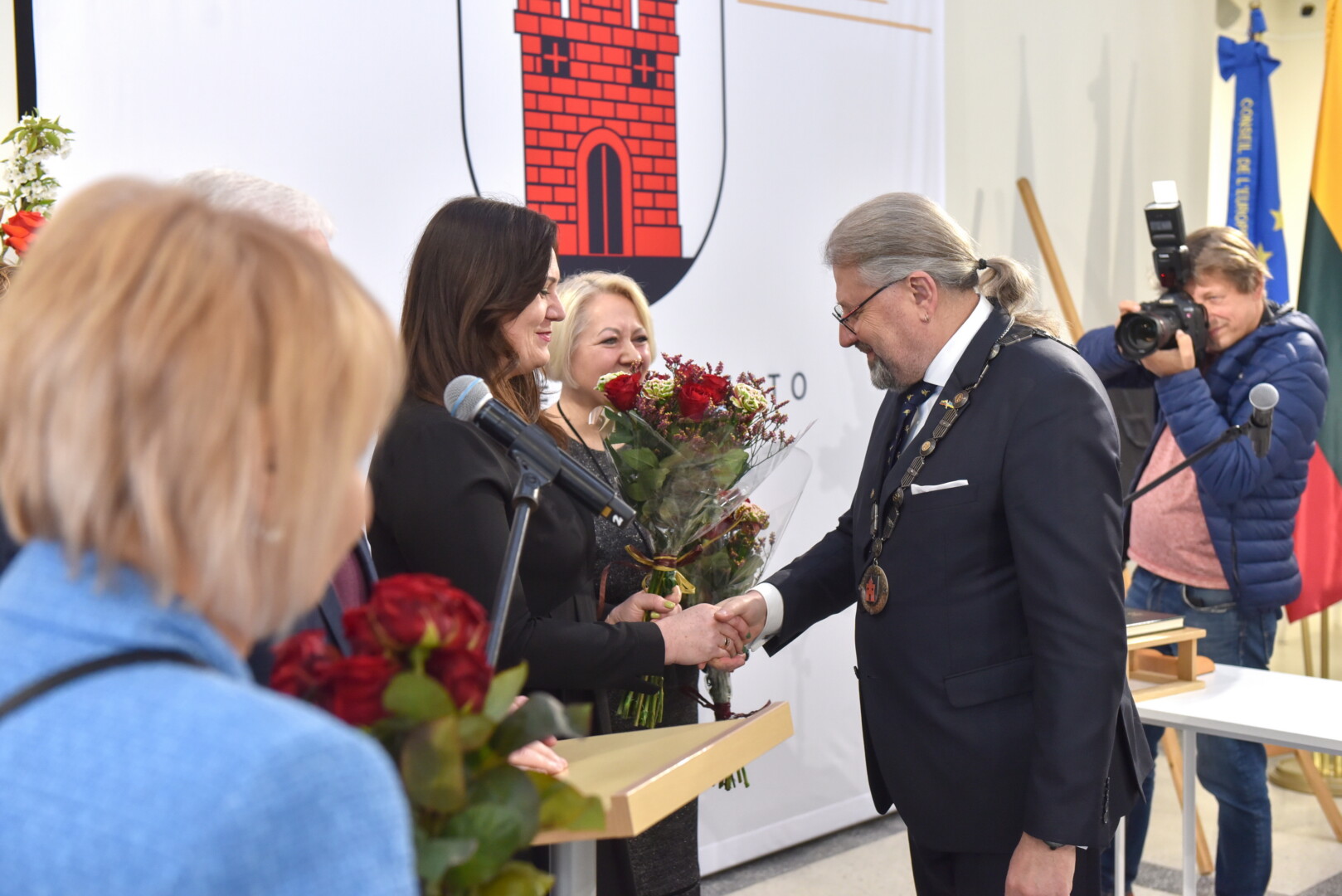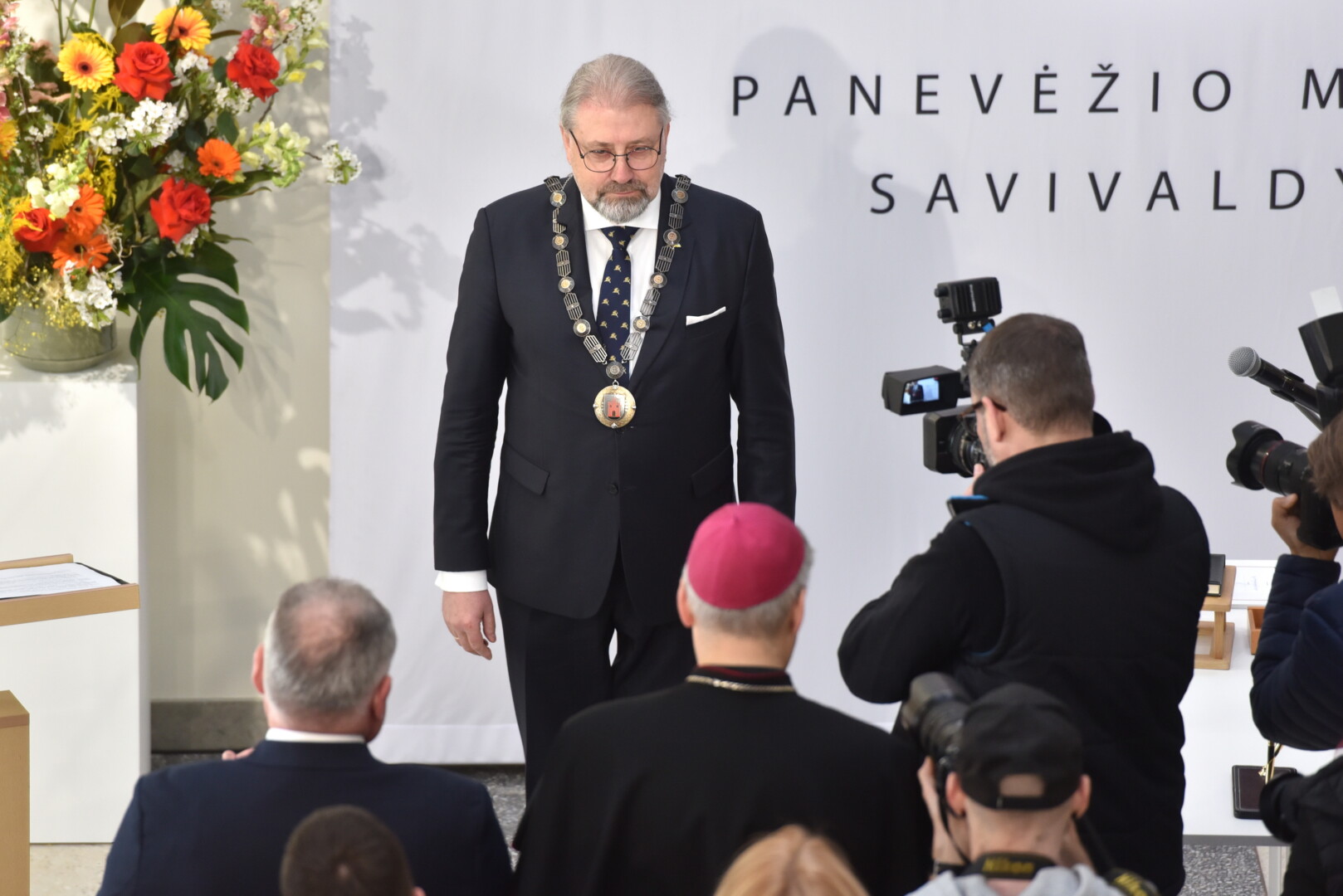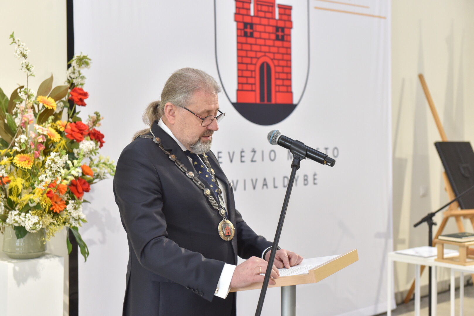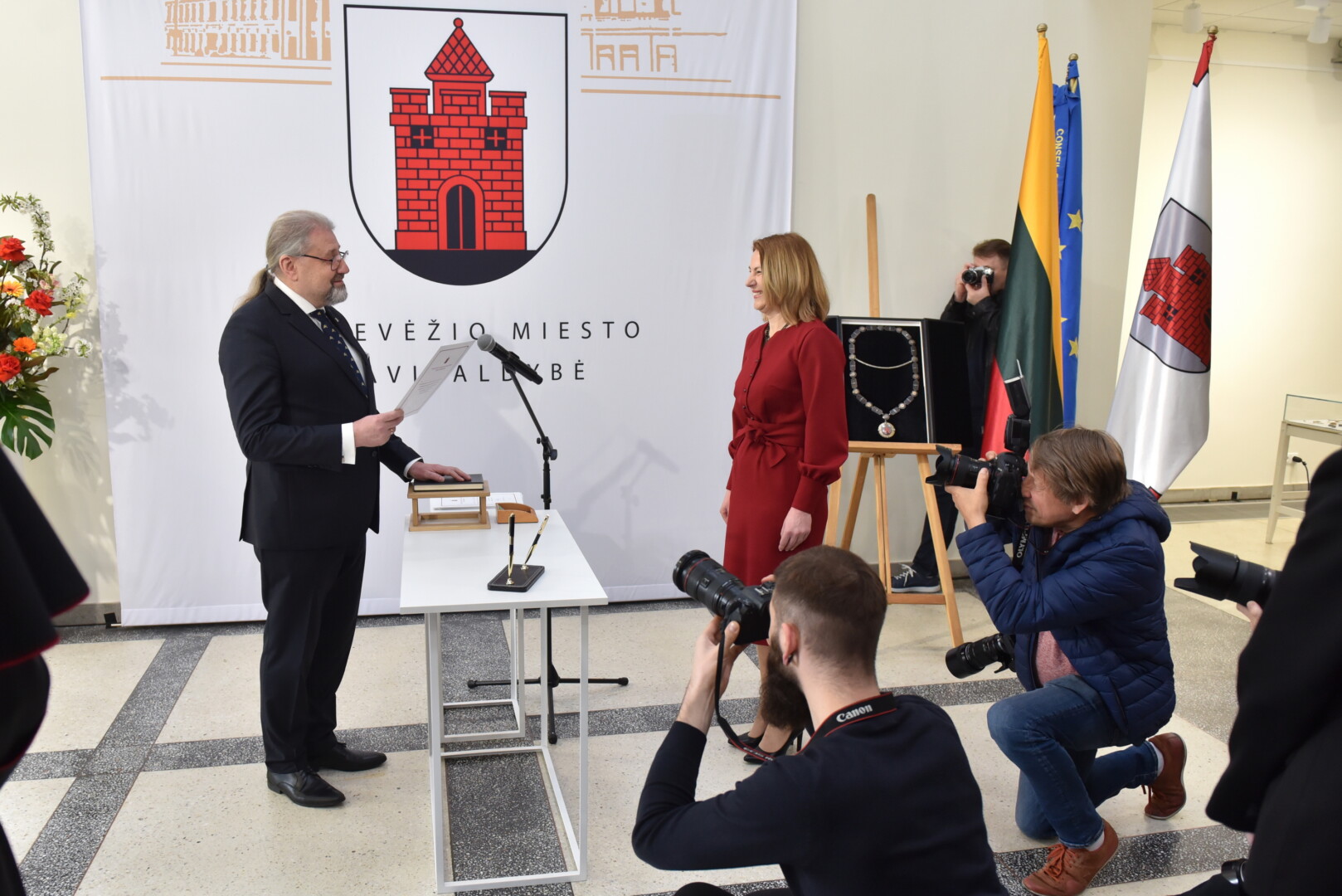 Trečiajai kadencijai inauguruotam merui regalijas įteikė Panevėžio rinkimų komisijos pirmininkė Zita Stripeikienė.