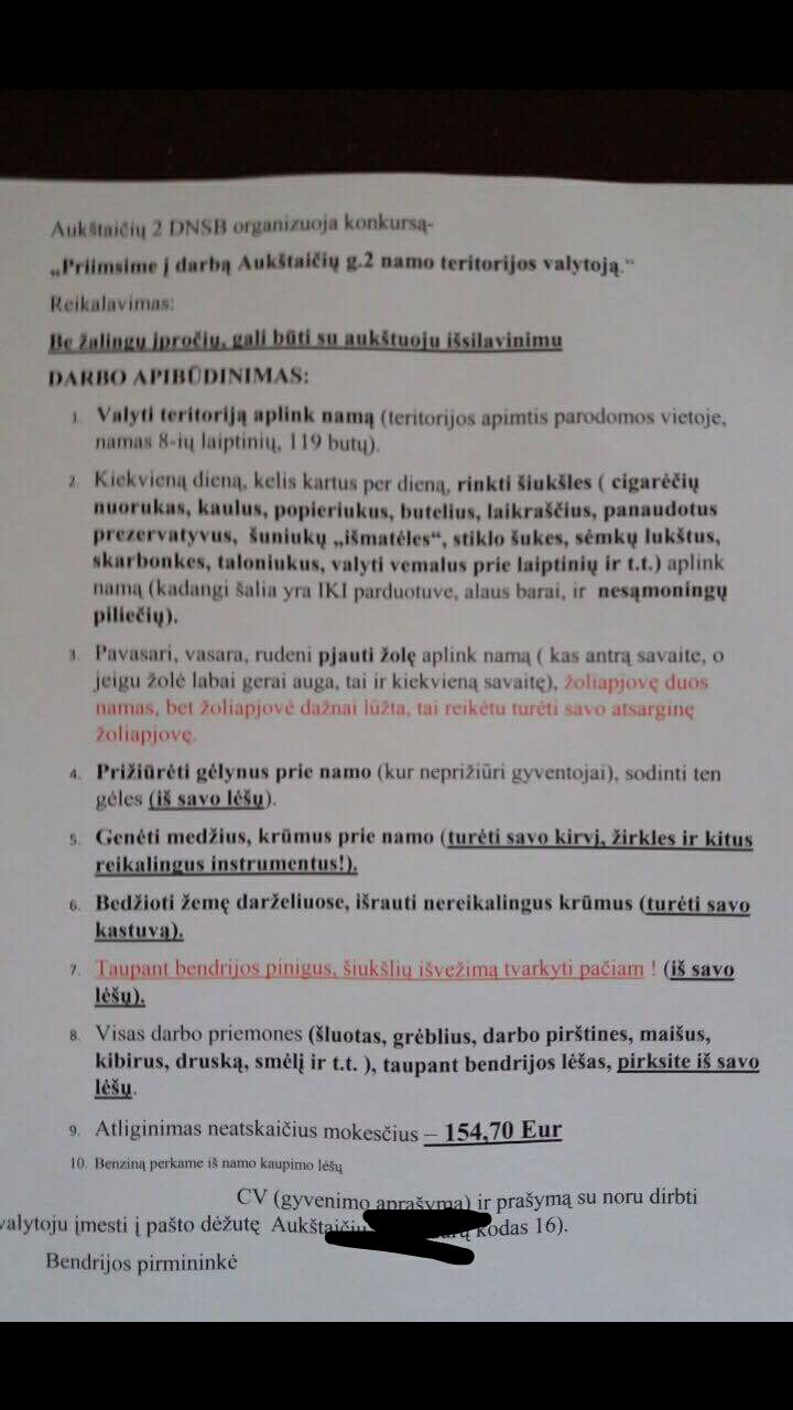 Juose buvo skelbiamas daugiabučio namo bendrijos konkursas dėl namo teritorijos valytojos darbo vietos. Pagrindinis reikalavimas pretendentams – neturėti žalingų įpročių bei galimas aukštasis išsilavinimas.