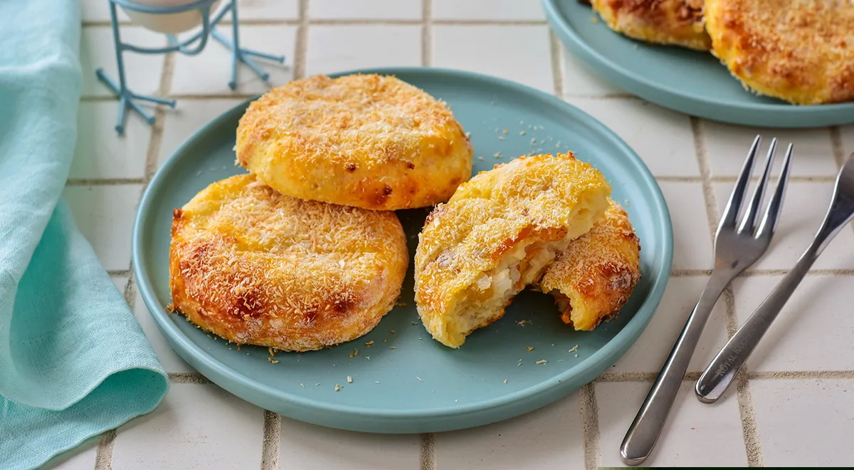 Kiaušinio trynį suplakite su pienu ir konditeriniu teptuku aptepę varškėčius, pabarstykite kokosų drožlėmis. O tada kepkite 25–30 minučių.