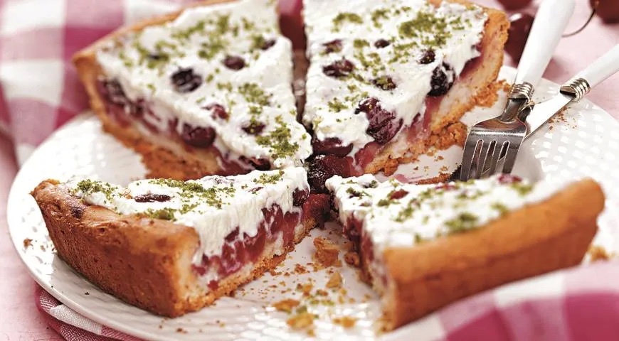Reikės (8 porcijoms): 100 g cukraus, 1 kg trešnių, 1 šaukšto vyšnių degtinės (kirschwasser), 150 ml grietinėlės (30 proc.), 200 g sausų migdolinių sausainių, 200 g miltų, 100 g sviesto, druskos.