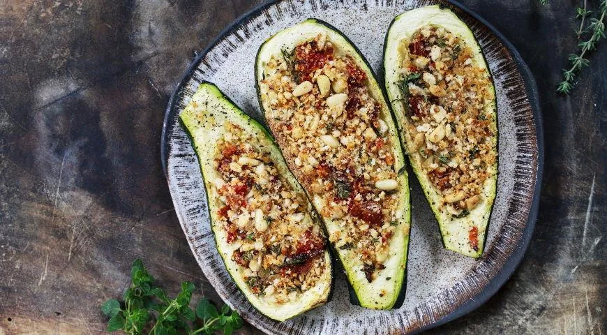 Reikės (4 porcijoms): 4 cukinijų, 1 svogūno, 4 saldžių pomidorų, 1 paprikos, 2 šaukštų žaliųjų arba juodųjų alyvuogių be kauliukų, 2 česnako skiltelių, 1 aitriosios paprikos, 130 g liesos varškės, 75 g maltų džiūvėsių, 75 g kedrinių pinijų, alyvuogių aliejaus – kepti, nedidelio ryšelio petražolių, pipirų, druskos.