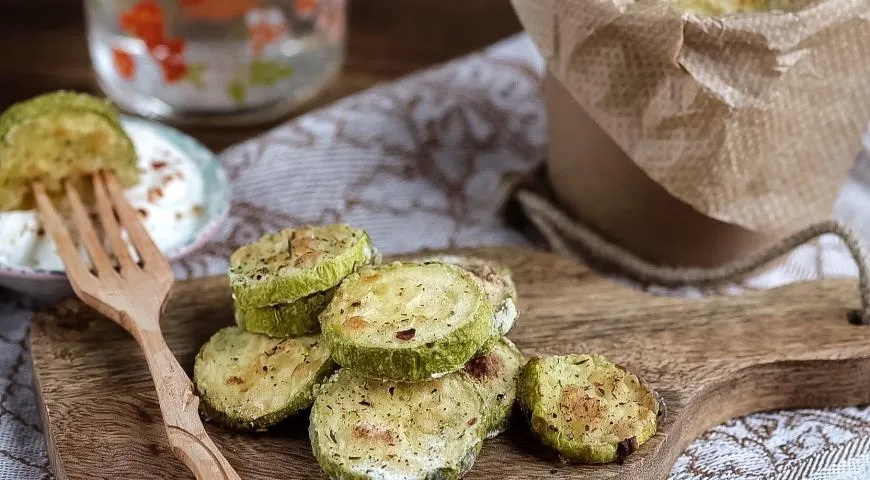Reikės (3 porcijoms): 3 cukinijų, 2 šaukštų visagrūdžių ryžių miltų, 0,5 šaukšto jūros druskos, 2 šaukštų alyvuogių aliejaus, mėgstamų prieskonių (pavyzdžiui, itališkų žolelių); padažui: 200 g jogurto, 1–2 česnako skiltelių, druskos.
