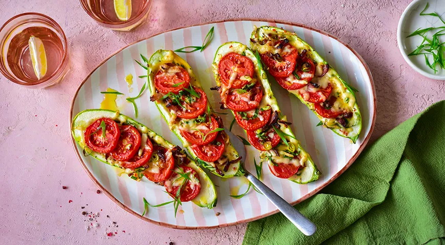 Orkaitėje keptos cukinijos su pomidorais ir sūriu