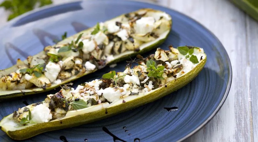 Cukinijas perpjaukite išilgai. Atsargiai pašalinkite šerdis ir jas atidėkite. „Laivelius“ pabarstykite druska, pipirais, pašlakstykite alyvuogių aliejumi ir pašaukite iki 200 laipsnių įkaitinton orkaitėn 8–10 minučių.