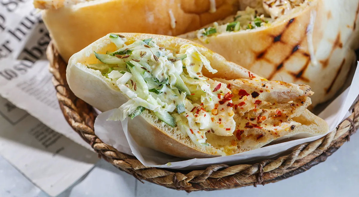 Reikės (4 porcijoms): 4 stambių viščiukų krūtinėlių, 1 mažos pekininio kopūsto gūžės, 2 vidutinių šviežių agurkų, 50 g svogūnų laiškų, 4 šaukštų majonezo, 2 šaukštų alyvuogių aliejaus, 1 šaukštelio maltų kuminų, 4–5 pitų, druskos, šviežiai maltų juodųjų pipirų.