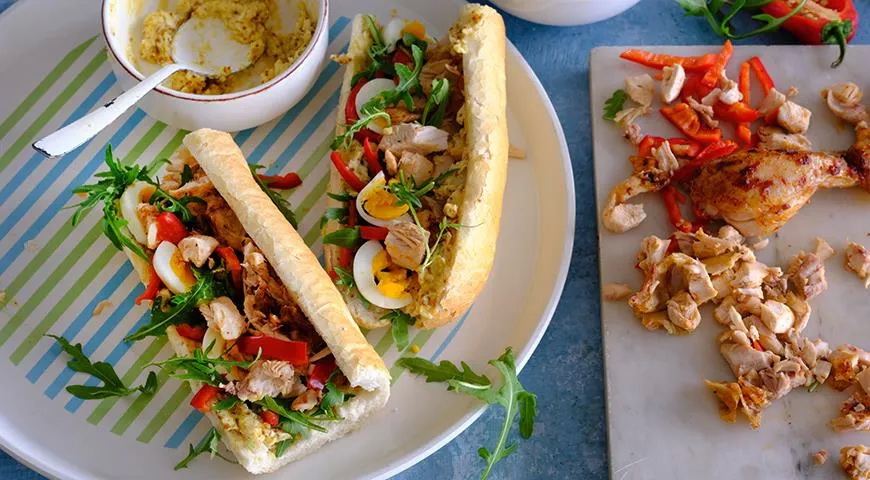 Batoną įpjaukite išilgai, bet ne iki galo – tik kad atsiverstų kaip knyga. Išimkite didesniąją dalį minkštimo, aptepkite garstyčių padažu ir viršutinę, ir apatinę dalis. Į apatinę pridėkite vištienos, ant jos – paprikų, kiaušinių ir špinatų arba gražgarsčių. Užvėrę sumuštinį patiekite.