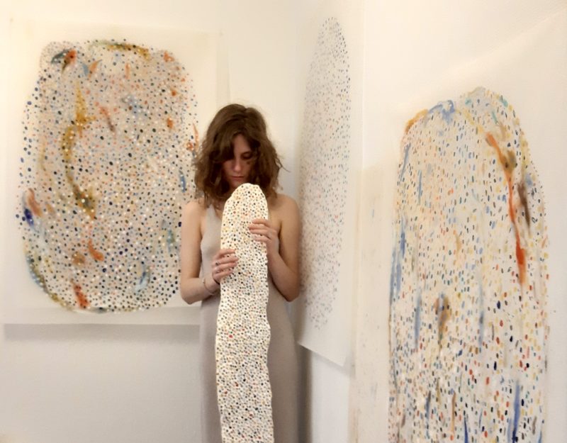 E. Povilonytė pasinėrė į užburiantį popieriaus ir dažo kontakto tyrinėjimą. Erikai dabar pats teptuko ir popieriaus susilietimas yra toks stebuklingas, kad, atrodo, daugiau nieko ir nebereikia.