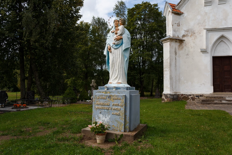 Koplyčios šventoriuje pasitinka ta pati dangiškoji Marija – mėlynu apsiaustu su žvaigždžių vainiku ant galvos ir su kūdikiu ant rankų.