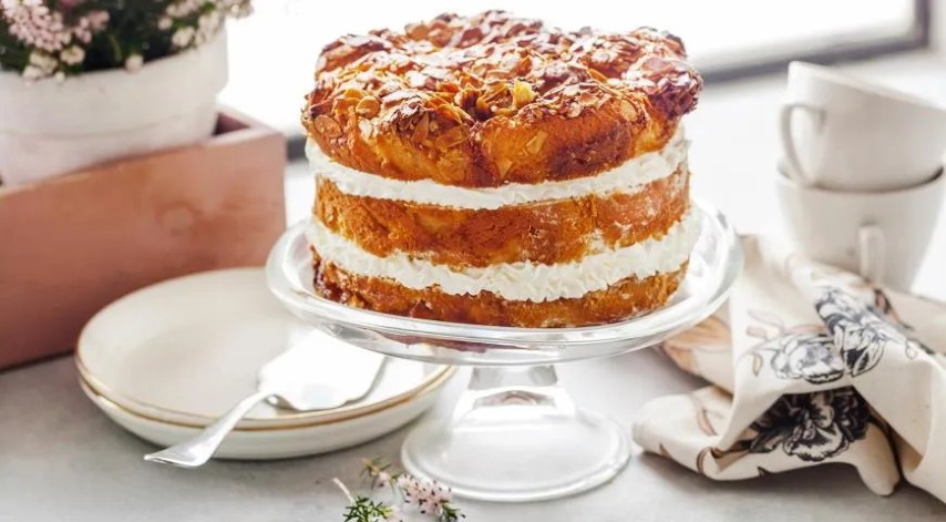 Reikės (12 porcijų): 350–400 g miltų, 3 kiaušinių, 140 ml pieno, 85 g kambario temperatūros sviesto (ir dar šiek tiek keksui aptepti), 60 ml medaus, 1 šaukštelio migdolų ekstrakto (arba 2 šaukštų migdolų likerio), 2 šaukštelių sausų mielių, 1 šaukštelio druskos; kremui: 375 ml pieno, 1 vanilės ankšties, 4 didelių kiaušinių trynių, 100 g rudojo cukranendrių cukraus, 2 šaukštų kukurūzų krakmolo, 2 šaukštų miltų, 2 šaukštų sviesto, 180 ml grietinėlės (35 proc.), 100 g miltelinio cukraus; papuošti: 100 g migdolų lapelių, 85 g sviesto, 75 g cukraus, 3 šaukštų medaus, 2 šaukštų grietinėlės (35 proc.), žiupsnelio druskos.